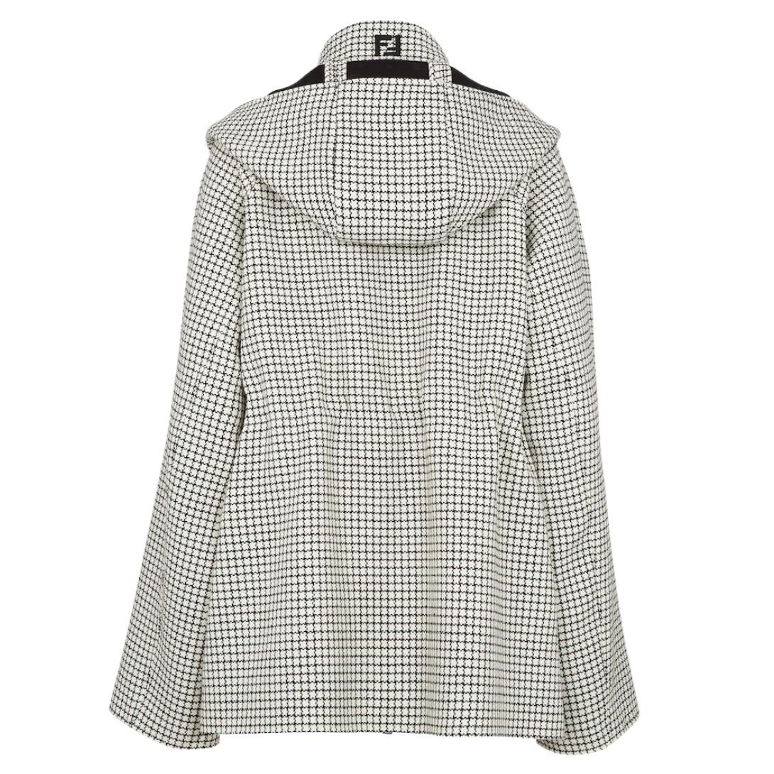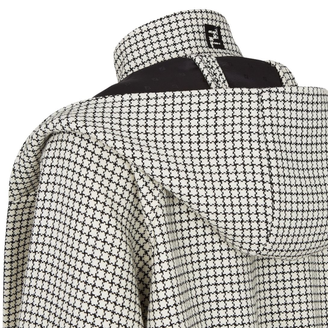 The jacket showcases a concealed zip fastening with a double slider for ease of wear. Crafted from a black and white check motif wool fabric, it offers a sophisticated yet contemporary look. The hood is designed with a foulard-like insert and features black FF micro jacquard satin inserts, creating a lapel effect for a distinctive touch. The back of the collar is adorned with a contrasting embroidered FF logo, adding an extra detail to the design.