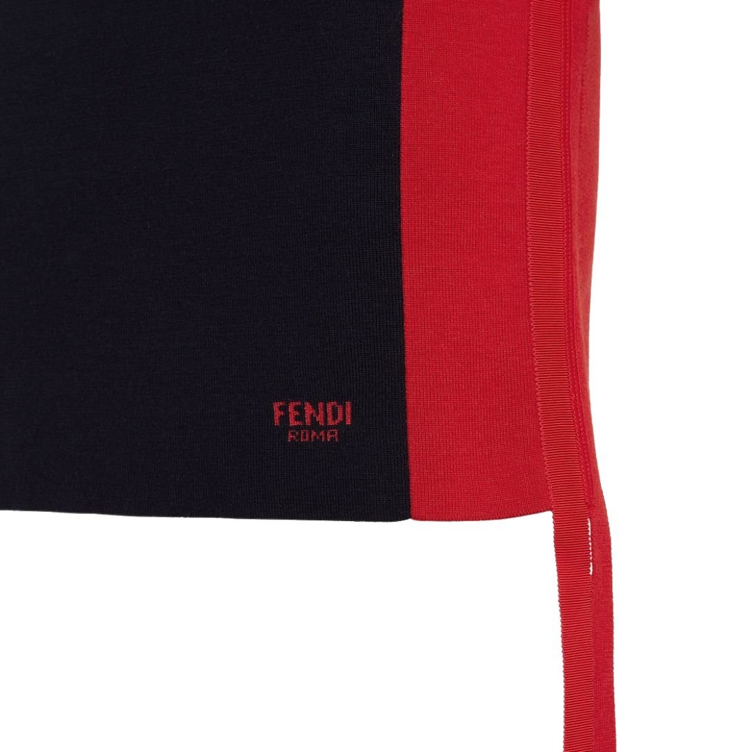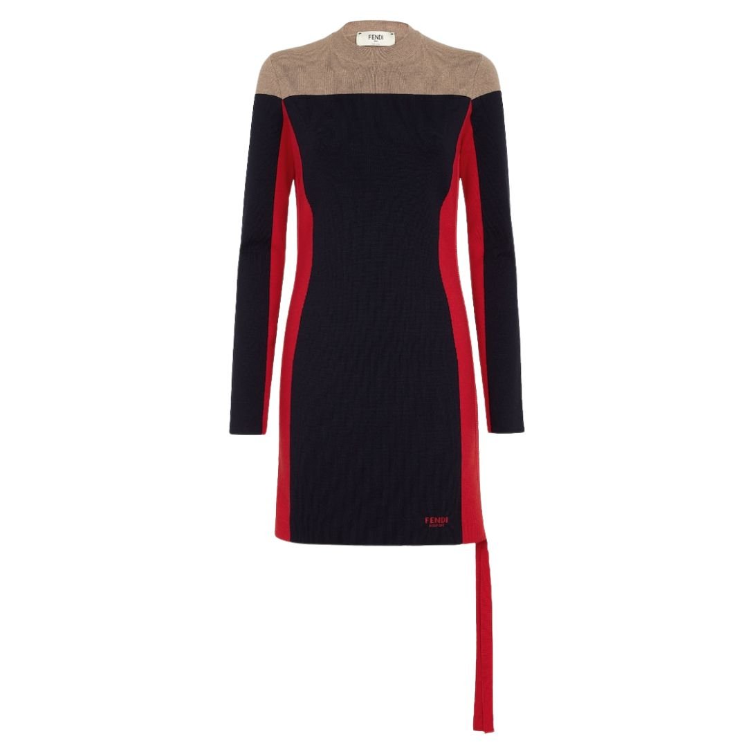 Crafted from blue wool and viscose yarn, the dress features retro sky-style color-block inserts. Beige accents on the shoulders and yoke, and red detailing on the inside of the sleeves and sides, add visual interest and a dynamic look. The contrasting Fendi Roma logo intarsia on the hem adds a bold, signature finish to the design.