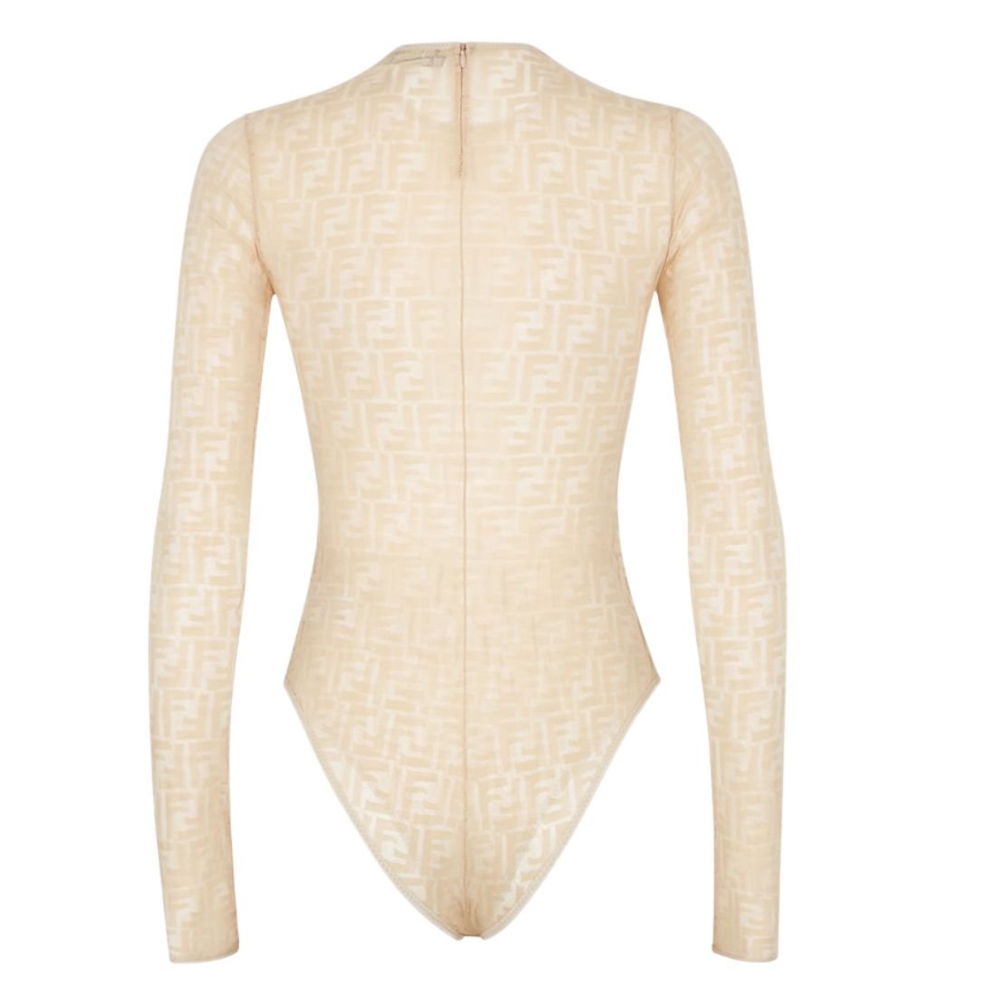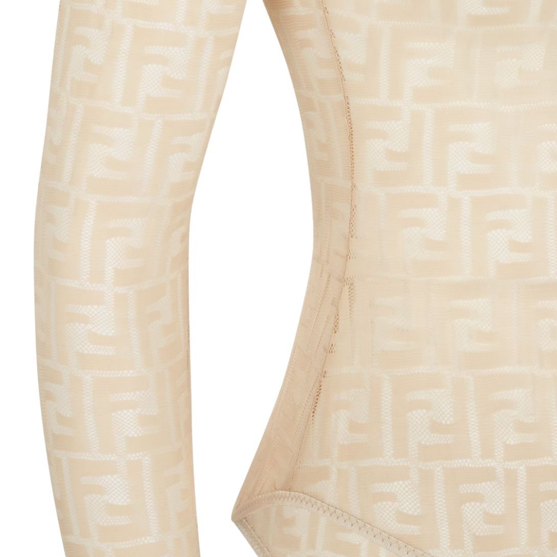 Crafted from intricate lace, the bodysuit is adorned with an all-over beige FF motif, blending luxury with contemporary style. The iconic pattern adds texture and visual appeal, making it a statement piece for various occasions.
