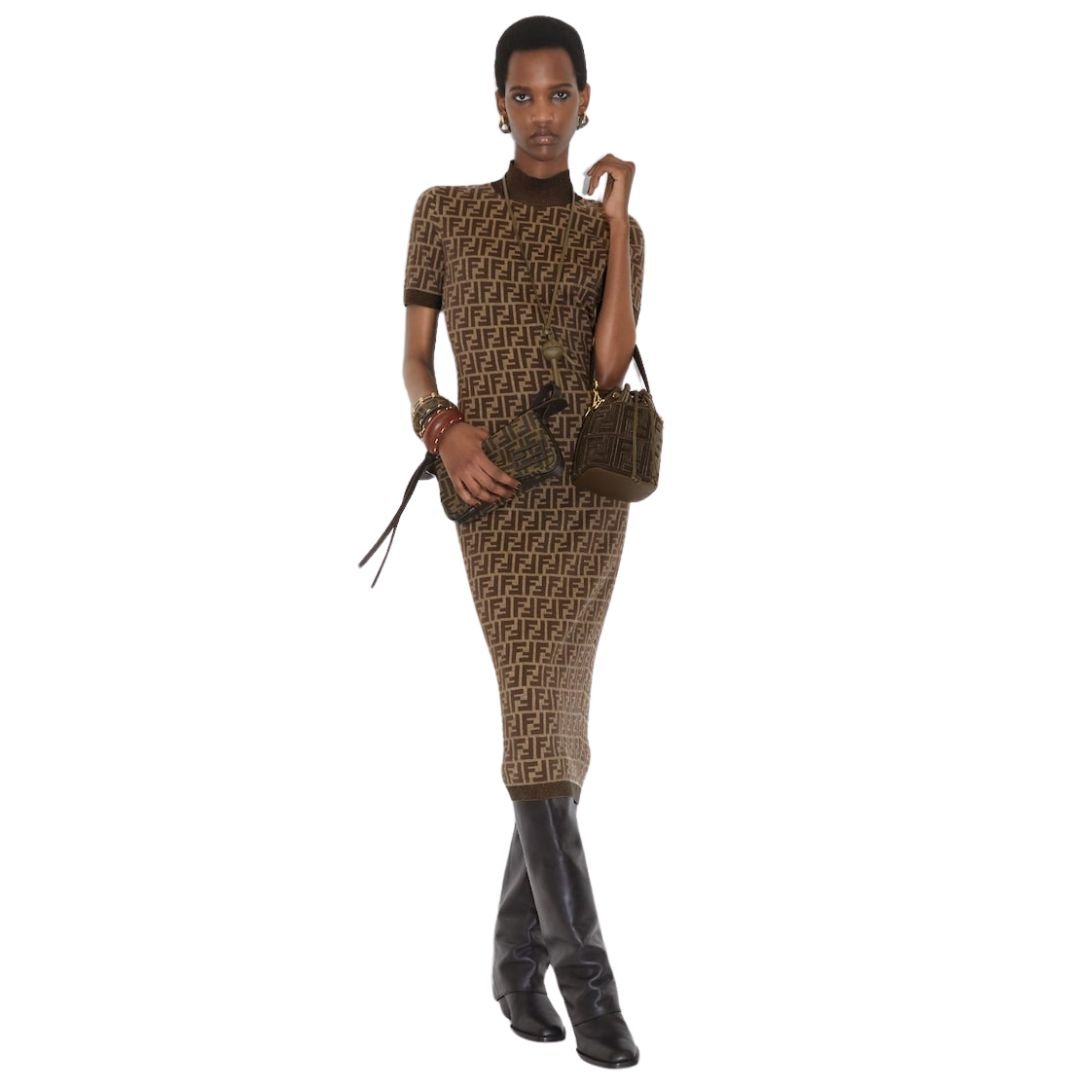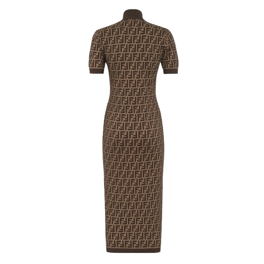 This fitted midi dress features a high neck and short sleeves, crafted to offer both style and comfort. Made of a cotton knit with an iconic brown FF motif jacquard, it showcases the signature Fendi design in a subtle yet distinctive way. Solid-color ribbed edges complete the dress, giving it a polished, sophisticated look.