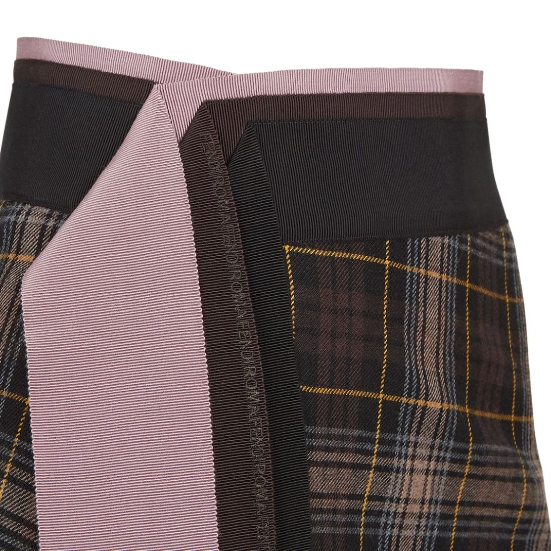 The skirt is finished at the waist and side with long color-block grosgrain ribbons in black, brown, and mauve. These ribbons feature on-tone micro Fendi Roma lettering embroidery, adding a refined touch and elevating the skirt’s overall design.
