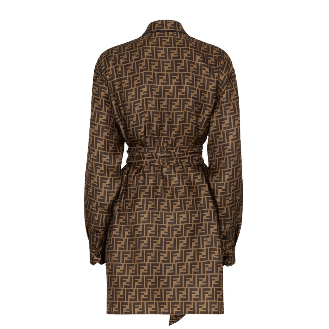 This shirt-style short dress combines sophistication with a relaxed, oversized fit. Featuring a classic collar and sleeves with button cuffs, it exudes a timeless charm, while the FF motif in brown and tobacco tones adds an unmistakable Fendi touch. The concealed button closure ensures a sleek silhouette, and the matching sash allows for added versatility.