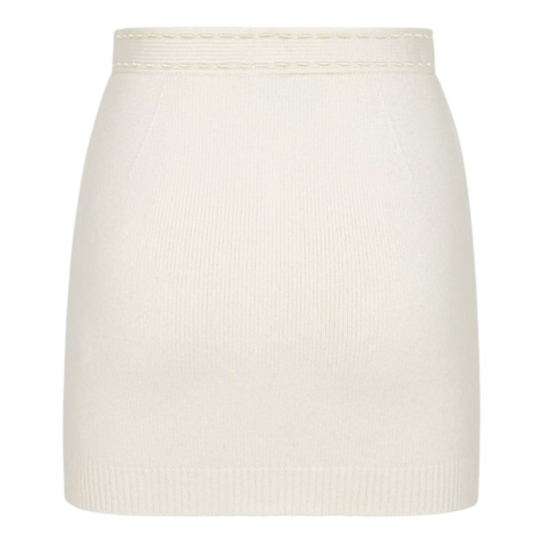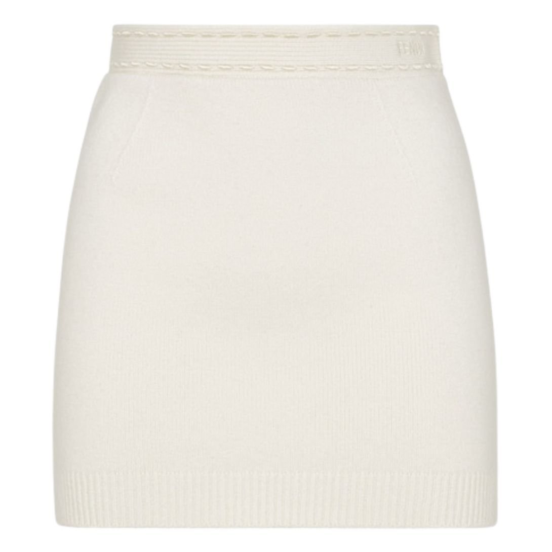 This short fitted skirt exudes sophistication with its clean lines and refined details. Made from luxurious white cashmere jersey, it features a ribbed edge for added texture. The waistline is accented with hand-sewn tone-on-tone macro topstitches, a hallmark of Fendi’s renowned Selleria craftsmanship—a tradition of artisanal excellence dating back to 1925.