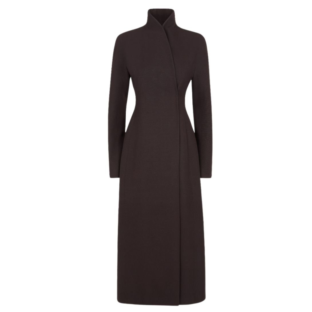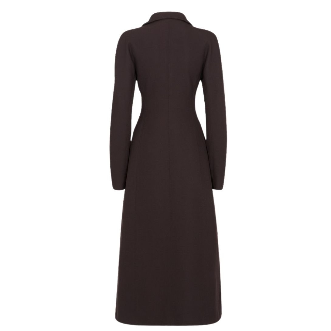Crafted from dark purple grain de poudre wool, the coat combines luxurious texture with timeless style. The side welt pockets provide functionality, and the concealed closure enhances its sleek, streamlined appearance.