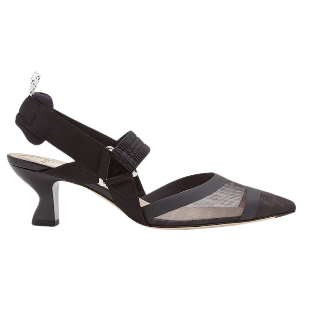 These Colibrì slingbacks feature a sleek pointed toe and stretch ribbons that wrap around the foot for a secure and stylish fit. Crafted from black tech mesh with the iconic FF motif, they are enhanced with tone-on-tone rubberized leather edges for a modern, minimalist look. The sole is finished with rubber inserts, offering additional comfort and durability. The padded cushion and hiking shoe tab introduce a sporty element, while the black lacquered heel adds a polished touch.