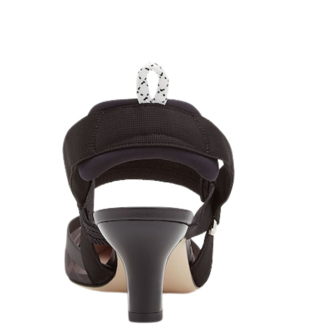 Featuring a 55 mm black lacquered heel, these slingbacks provide a subtle lift while maintaining exceptional comfort and stability. The stretch ribbons and padded design ensure a secure and adaptable fit, making them suitable for both casual and semi-formal occasions.