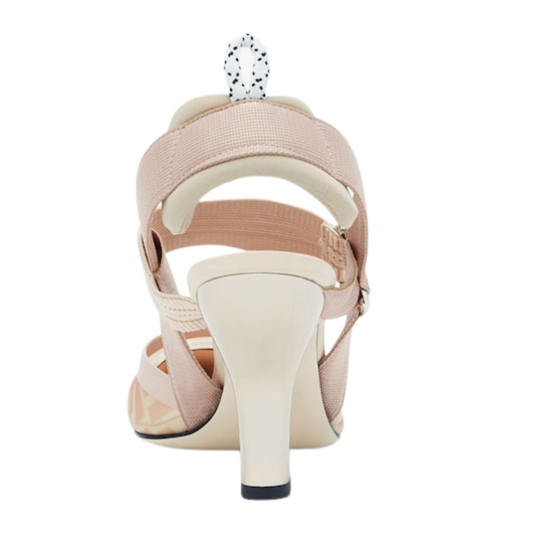 Streamlined and feminine, these Colibrì slingbacks are designed with elastic ribbons that gracefully wrap around the foot for a secure fit. The sole features rubber inserts for added durability and grip. Crafted from pink tech mesh adorned with the FF motif, the design is highlighted by rubberized nude leather edges. A padded cushion and hiking shoe tab introduce a sporty contrast, while the gold-colored plated metal heel elevates the overall elegance.