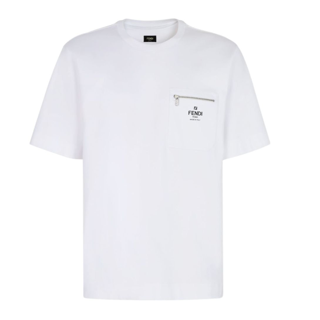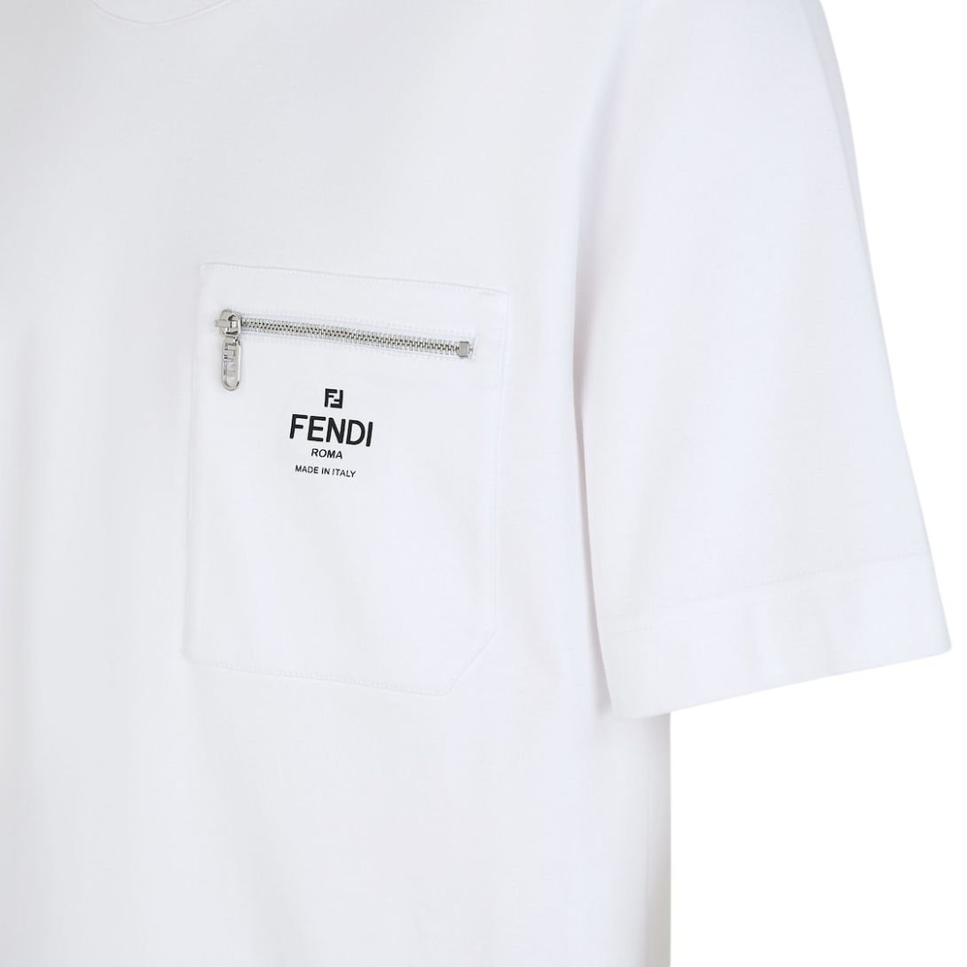 The T-shirt features a breast pocket, which is enhanced with a small printed Fendi Roma label, adding a subtle yet stylish branding element. The pocket also includes a zipper with a Fendi O’Lock slider, offering both functionality and a distinctive design detail that elevates the overall aesthetic.