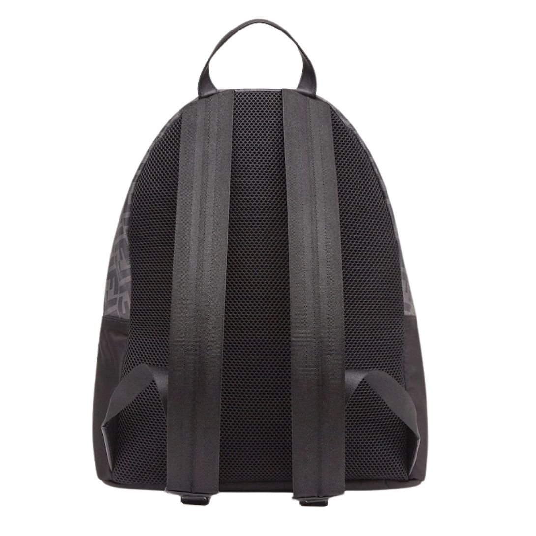 This large backpack is made of durable black nylon, offering a sleek, modern look with added functionality. The front pocket, crafted from gray textured weave fabric with the iconic FF motif, enhances its aesthetic while providing practical storage.