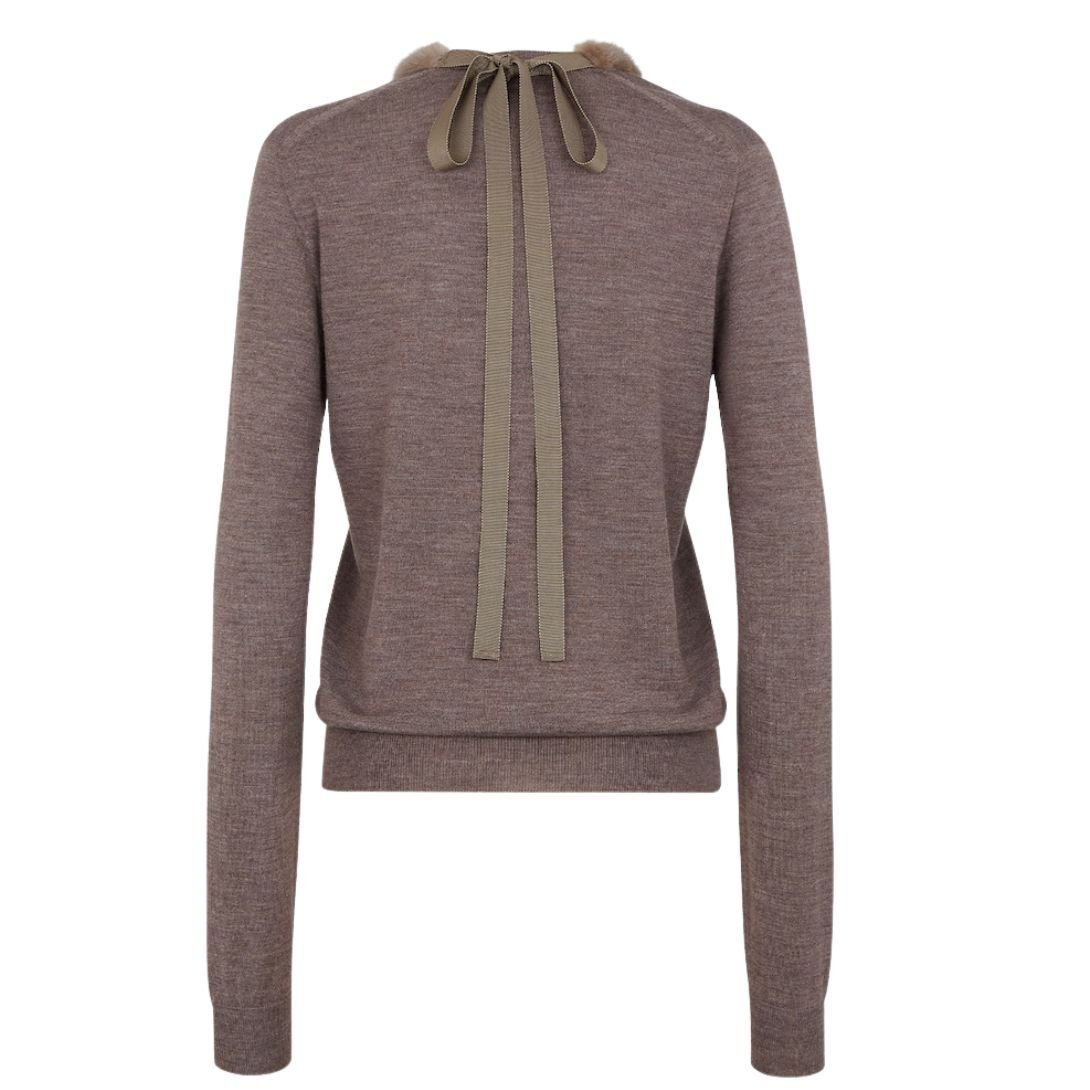 This long-sleeved V-neck sweater offers a relaxed silhouette and an elegant blend of textures. Made from dove gray wool and silk blend yarn in a seamless knit, it is finished with a matching mink collar, tied with grosgrain ribbons at the back. The sweater is embellished with a contrasting Fendi Roma logo intarsia at the hem, adding a distinctive touch to the design.