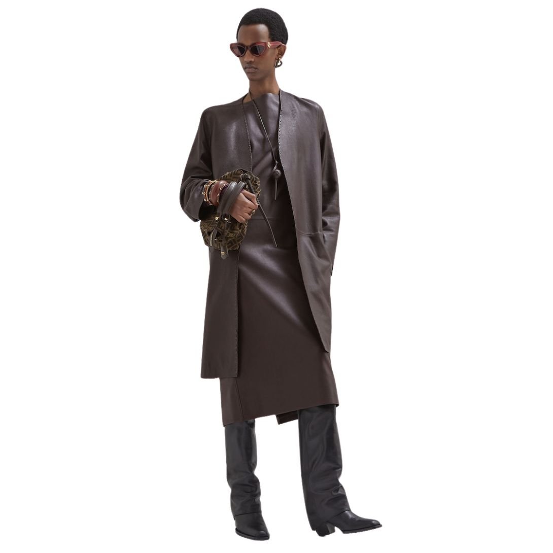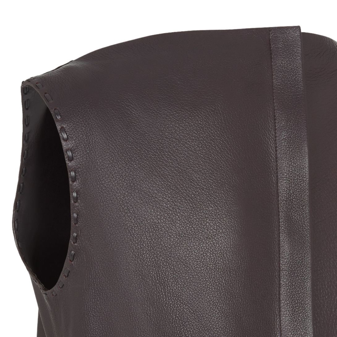 This striking sleeveless short dress embodies sophistication and craftsmanship with its sleek, modern design and luxurious leather material. The straight-cut silhouette offers a streamlined look, while the boat neck and concealed full-length zipper at the back add to its refined aesthetic. Crafted from soft, dark purple hammered leather, this dress stands out with its unique texture and high-end finish. The armholes are carefully embellished with hand-sewn tone-on-tone macro Selleria topstitches, a hallmark of Fendi’s iconic Selleria craftsmanship passed down through generations.