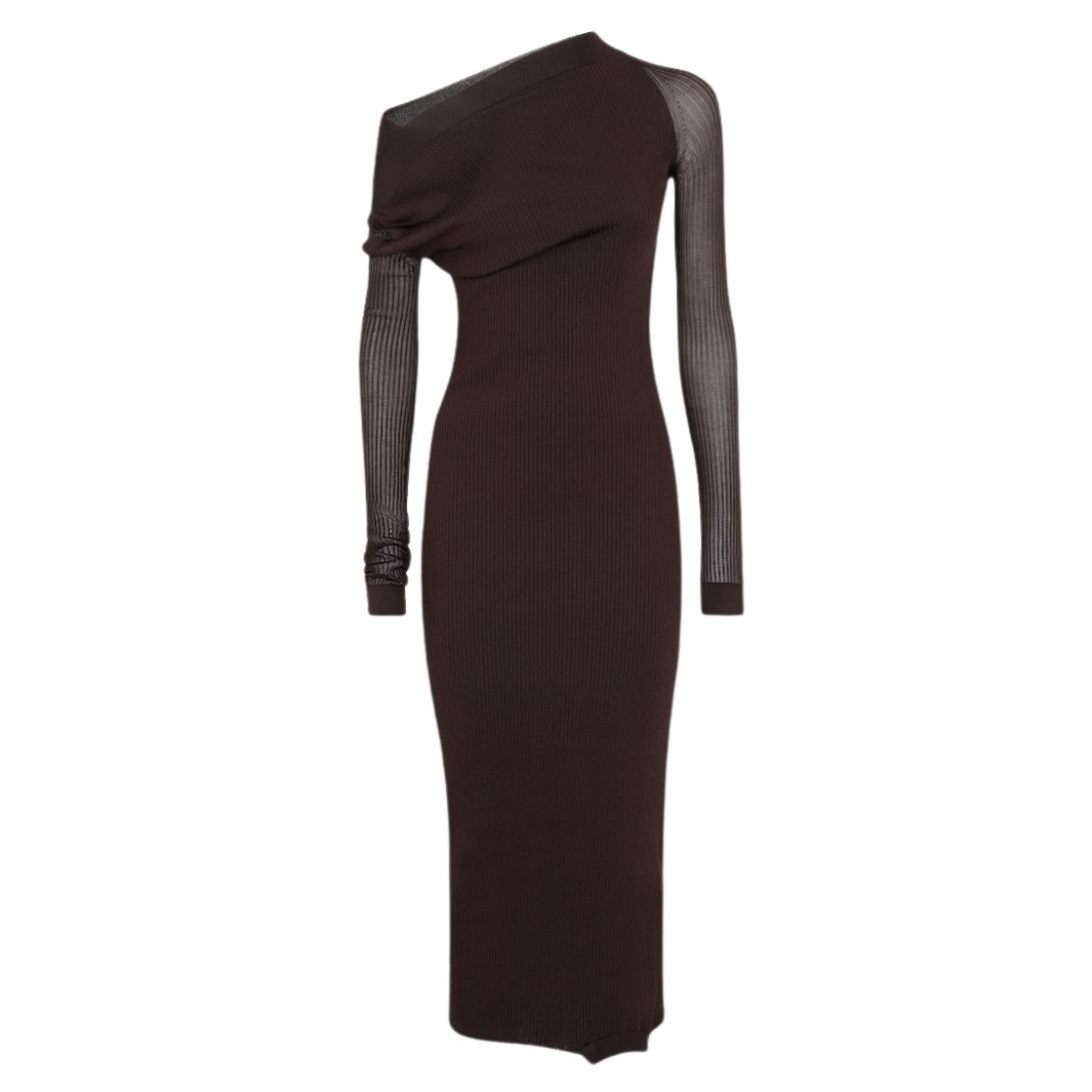 Crafted from dark purple extra-fine yarn, the fabric boasts a luxurious feel with ribbed detailing throughout. The dress incorporates sheer, see-through sleeves, which add a hint of allure to the overall look. The rib-knit neckline gracefully wraps over one shoulder, enhancing the asymmetry of the design.