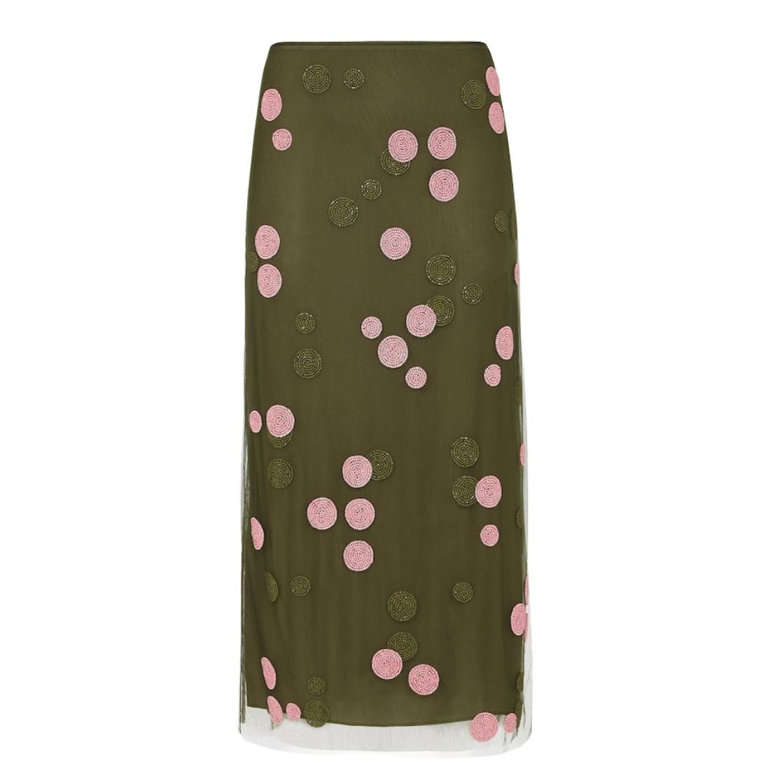 This straight-cut midi skirt offers a graceful silhouette and is crafted from lightweight dark green tulle, exuding femininity and charm. A bold, large polka-dot motif, created with bead embroidery in contrasting colors, adds a vibrant and artistic touch to the design. The side zipper closure ensures a seamless fit, while the lining provides structure and comfort.