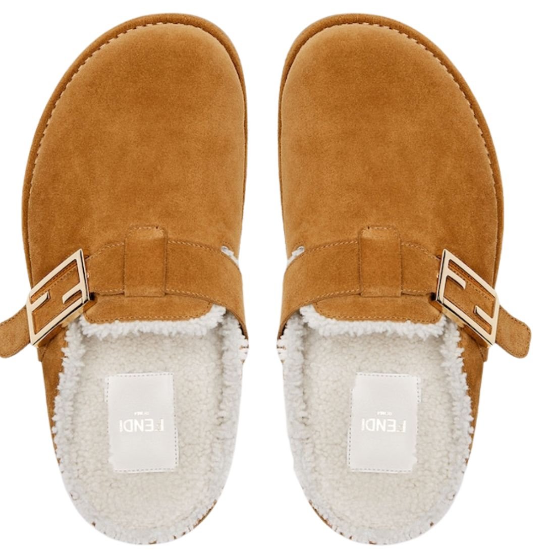 These sabots are elevated with an FF strap, showcasing Fendi’s signature style. Gold-finish metalware adds a touch of sophistication, making these versatile slip-ons a standout choice for casual or elevated ensembles.