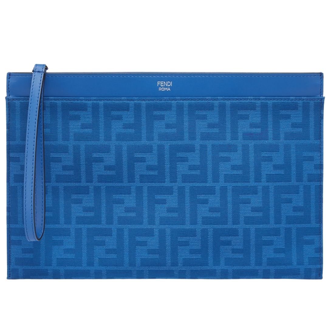 This medium-sized flat pouch is crafted from vibrant royal blue FF jacquard fabric, showcasing the iconic Fendi pattern in an eye-catching shade. The design is complemented by tone-on-tone leather details, adding a refined and sophisticated touch.