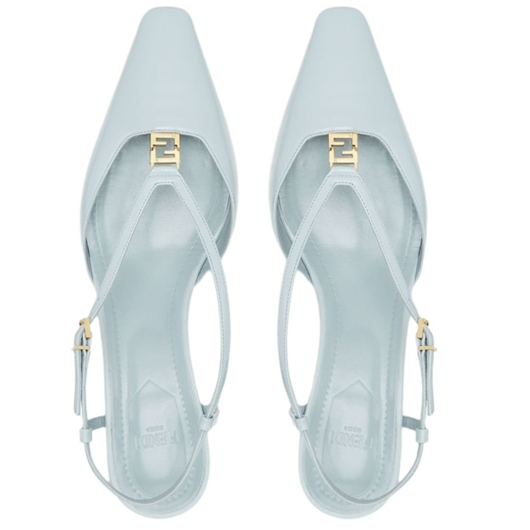 Made of premium light blue leather, these slingbacks are highlighted by a signature metal FF detail for a luxurious touch. A distinctive functional hinge in the center adds an innovative and modern element to the design. The tone-on-tone leather-covered heel and gold-finish metalware enhance their refined aesthetic, making them perfect for both casual and formal occasions.