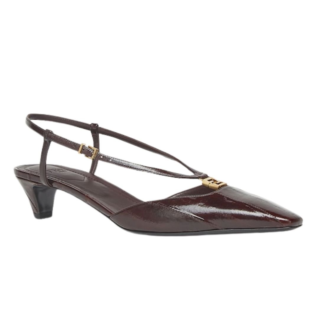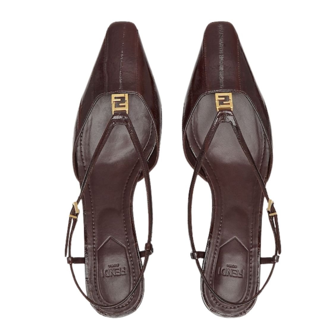 These elegant slingbacks feature a square toe and straps that wrap gracefully around the foot, combining style with functionality. The design highlights a distinctive metal FF detail with a central hinge, enhancing flexibility and comfort while walking. Crafted from shiny brown eel leather, the shoes showcase a luxurious texture, complemented by a tone-on-tone leather-covered heel and gold-finish metalware for a sophisticated finish.