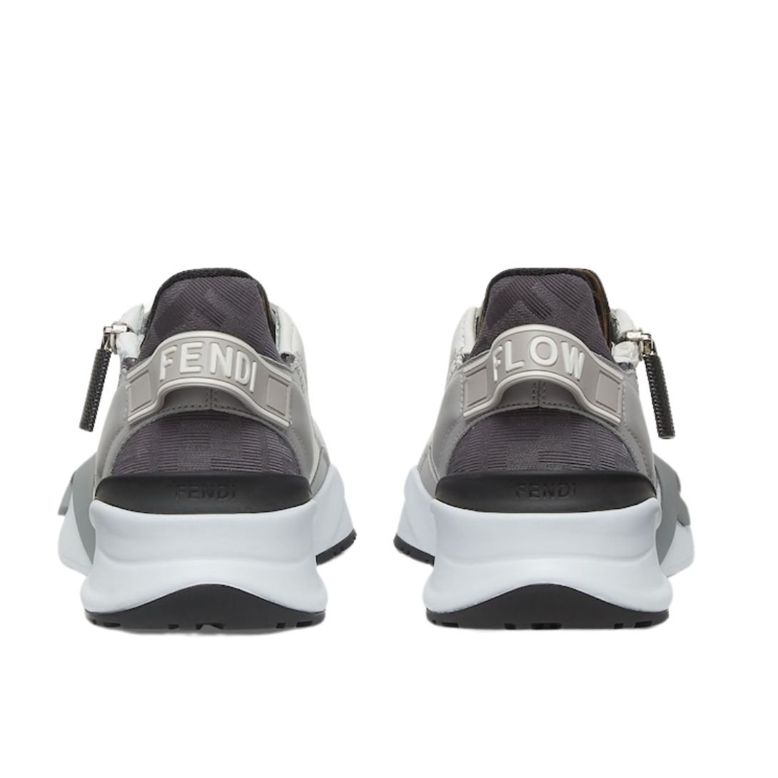 These Fendi Flow sneakers redefine casual luxury with their functional and stylish design. Featuring adjustable elastic laces and a convenient side zipper closure, they offer ease of wear and a secure fit. Made from premium gray leather with white leather accents and FF fabric detailing, the sneakers are enhanced by a customized FF pattern on the tongue and a rubber tab with an embossed Fendi logo on the heel. The 35 mm white rubber running sole, adorned with a gray diagonal F detail, ensures a modern look with exceptional comfort.