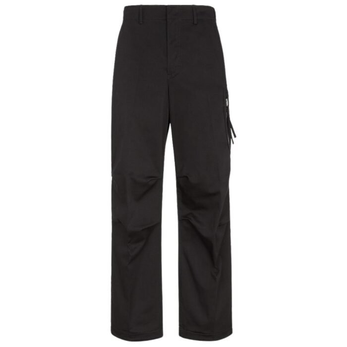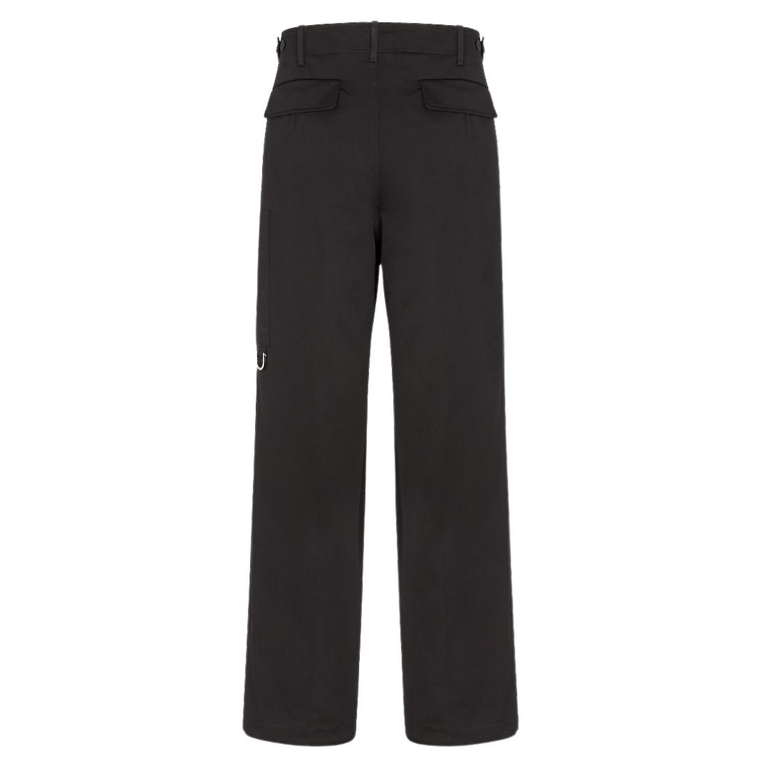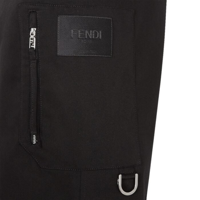Made in Italy, these pants are crafted from black cotton gabardine, providing durability and a smooth finish. The fabric composition includes 97% cotton and 3% elastane for slight stretch and comfort. A standout feature is the patch pocket on the leg, which is customized with an on-tone embroidered Fendi label. Additionally, the pocket is finished with a vertical zipper featuring a Fendi O’Lock slider and a palladium-finish metal ring for a luxurious, branded touch.
