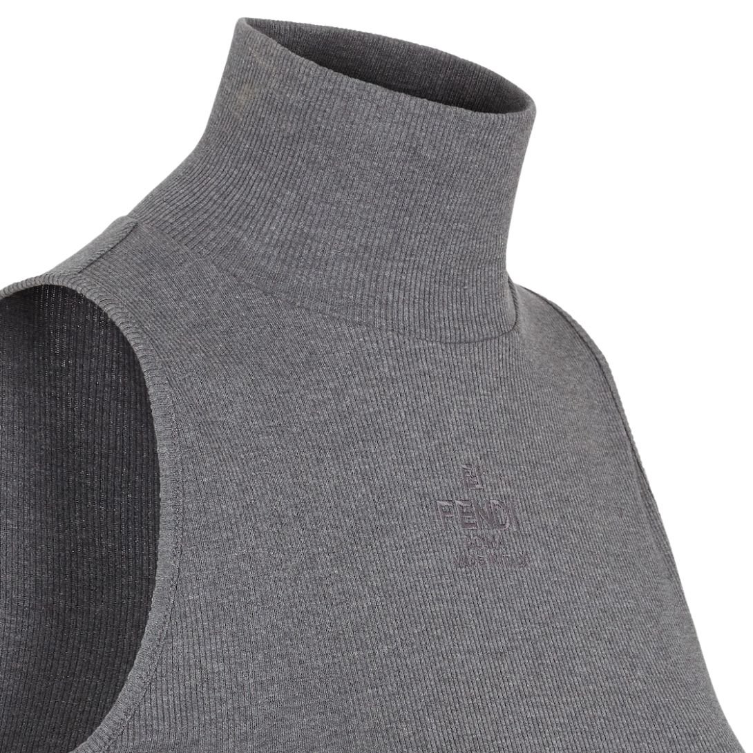 This high-neck sleeveless top offers a chic, contemporary silhouette with a luxurious touch. Made from soft gray mélange cotton jersey, the top features ribbing that adds texture and sophistication. The cropped design, sitting just at the waist, creates a flattering fit, while the slim cut ensures a sleek, streamlined shape. A subtle, embroidered tone-on-tone Fendi Roma logo adorns the chest, providing a refined yet understated mark of quality. This versatile piece can be dressed up or down, offering both comfort and style with its minimalist, modern appeal.