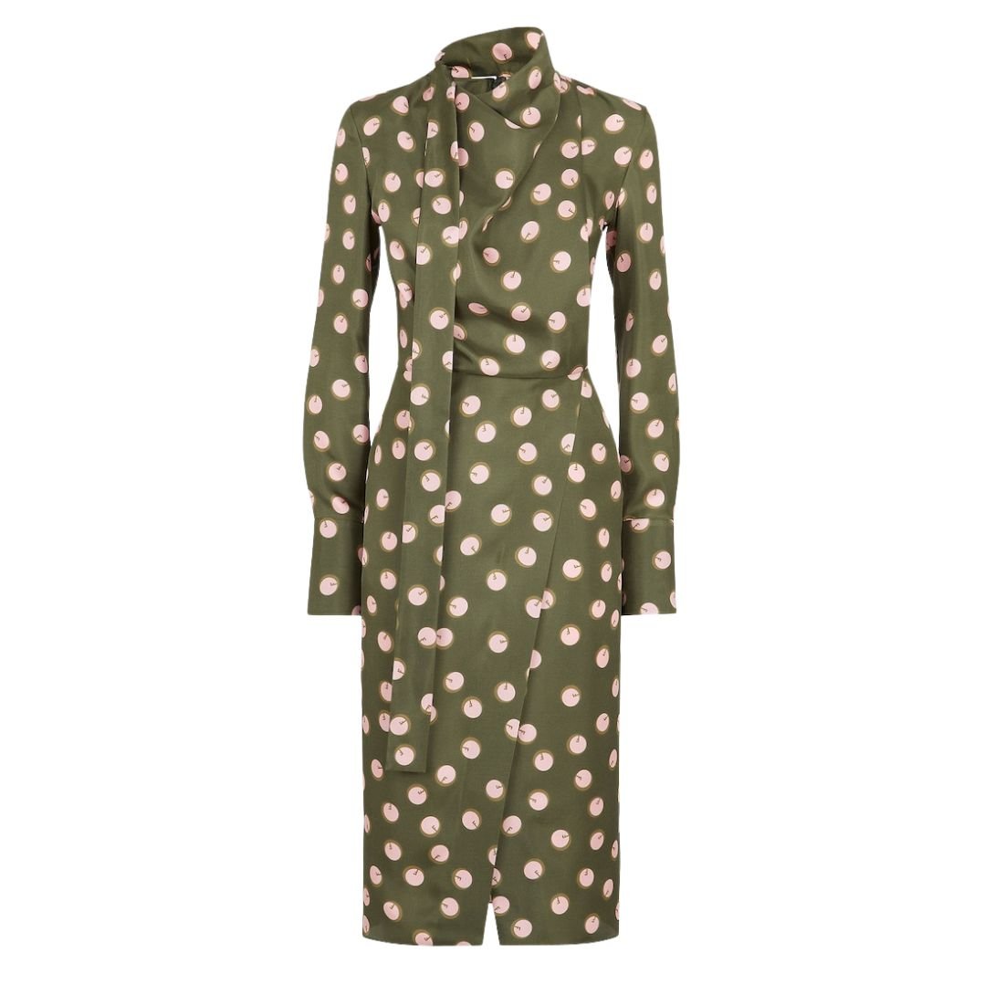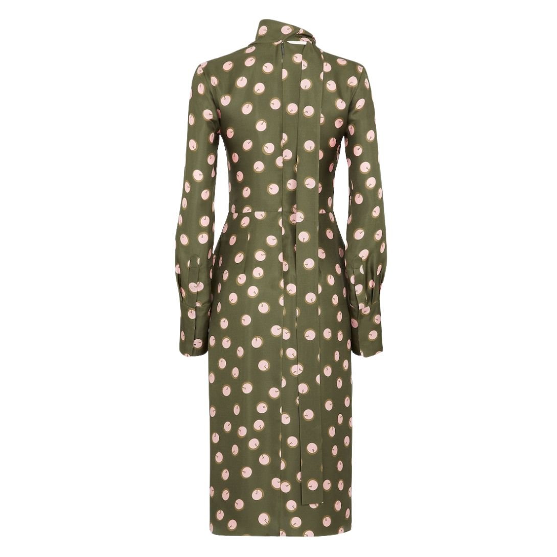 Made from luxurious silk twill, the dress is adorned with an all-over dark green and pink polka-dot Fendi motif print, adding a playful yet elegant touch to the design. The soft, smooth fabric provides both comfort and a polished appearance.