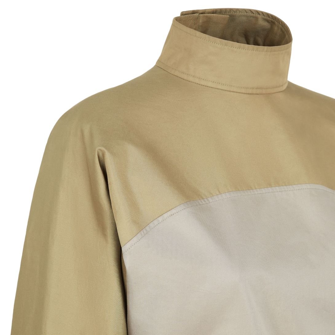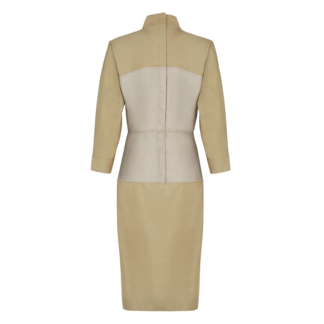 Crafted from olive green technical cotton, the dress provides a structured yet comfortable fit. The fabric is durable and breathable, offering versatility while maintaining a sleek, modern look. The contrasting central insert adds an extra layer of visual interest.