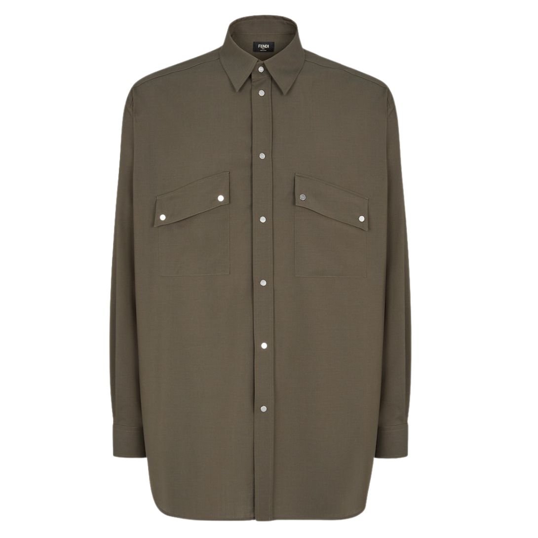 It includes patch pockets with flaps and snap buttons on the chest, adding both practicality and style. The metal logo button closure enhances the overall design with a sleek, polished finish.