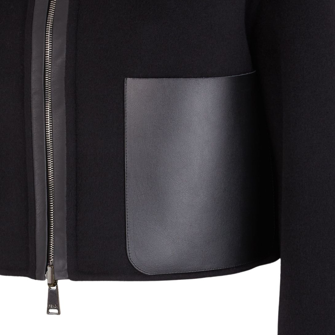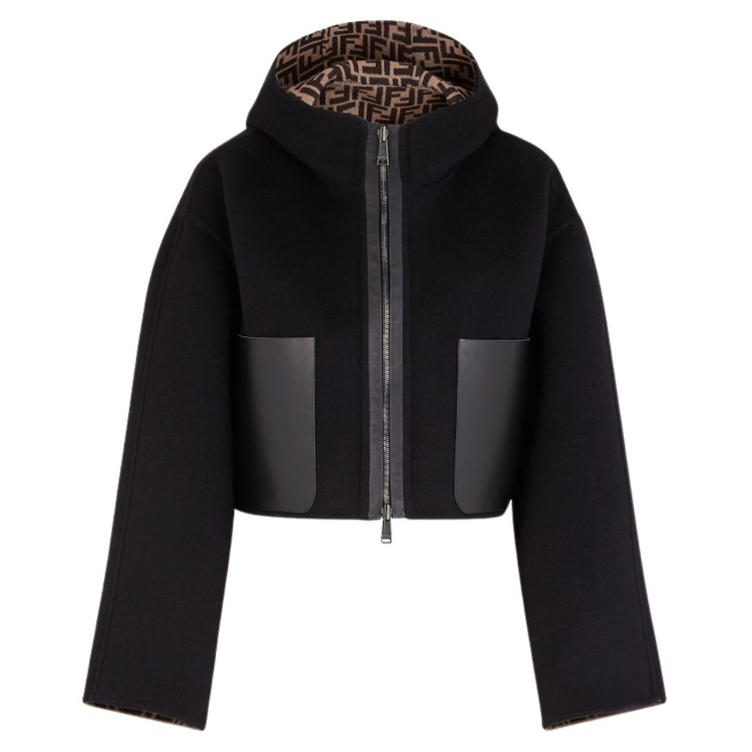 Crafted from black double-sided wool fabric, this jacket offers two styling options for ultimate versatility. Tone-on-tone calf leather pockets add a luxurious touch, while the interior lining is customized with an all-over FF motif, showcasing Fendi’s iconic design.