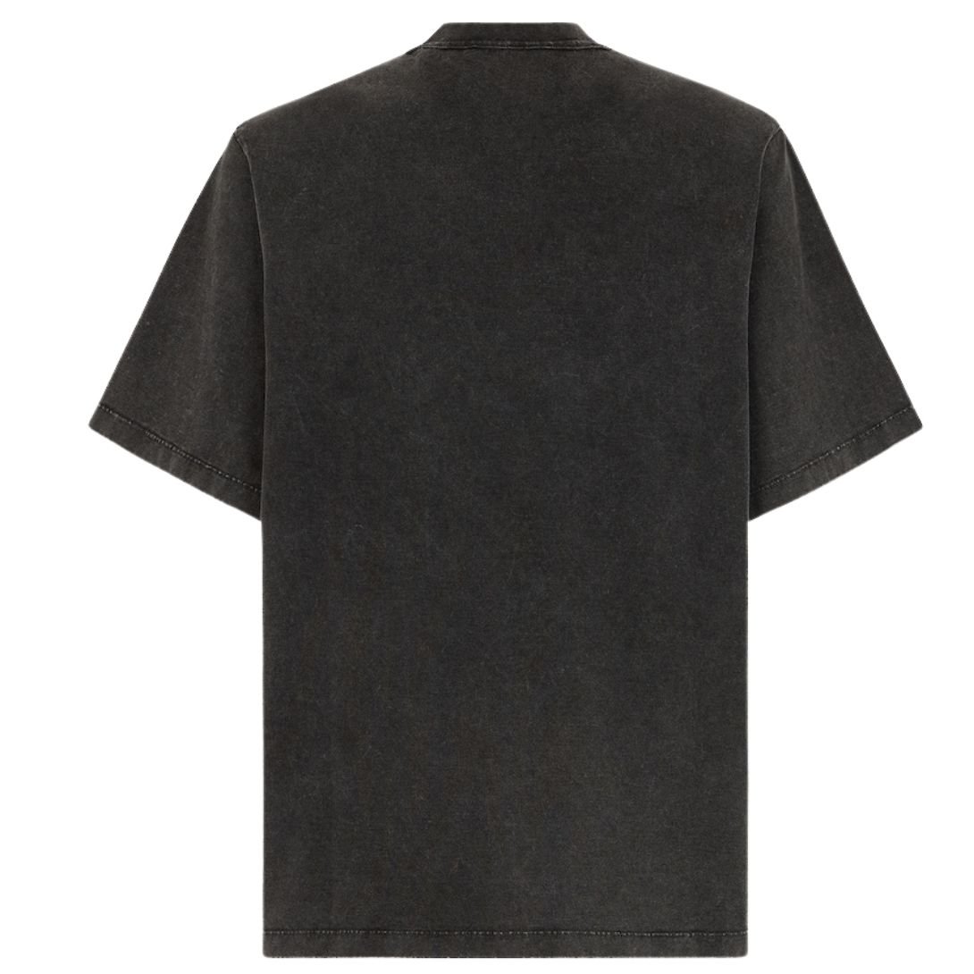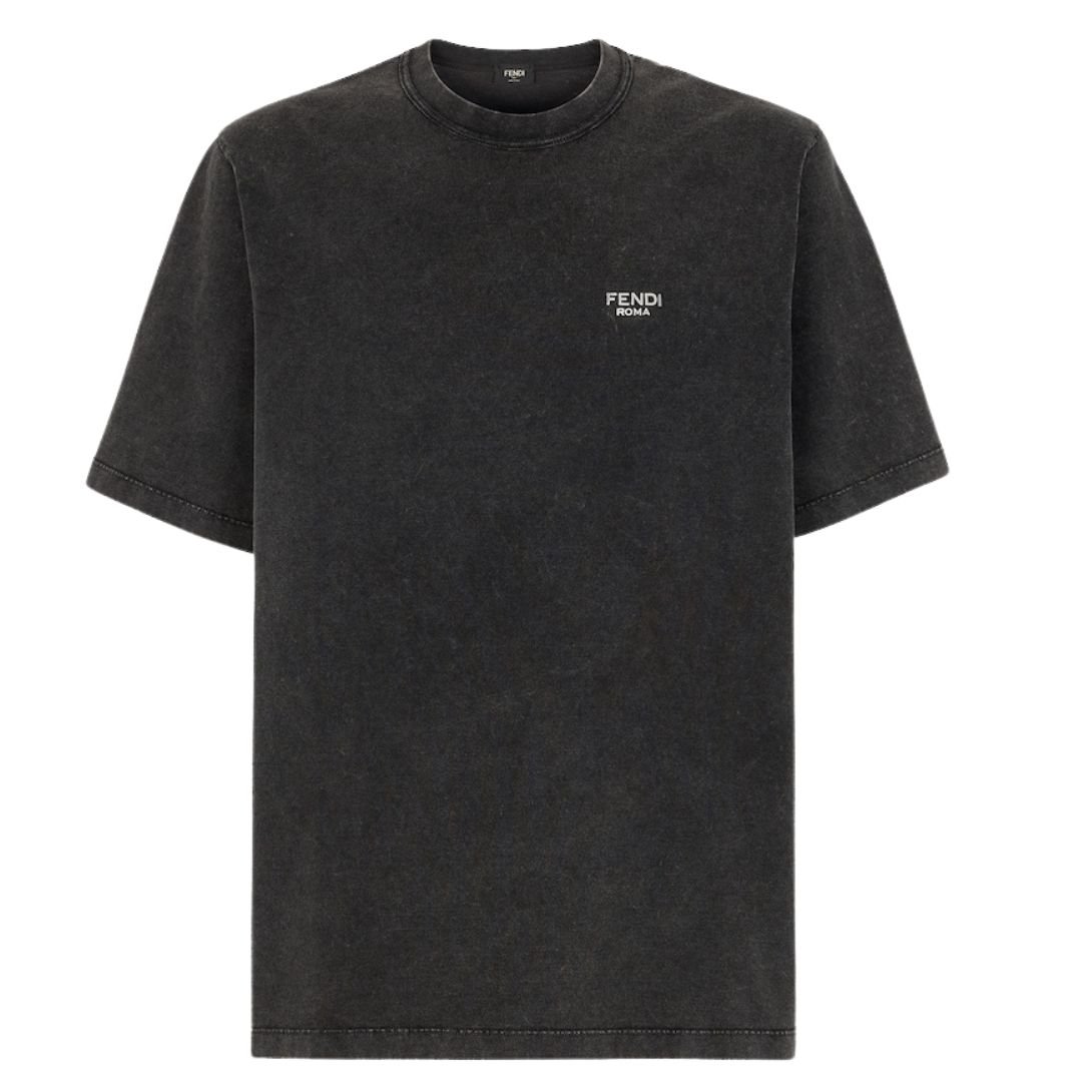 This short-sleeved, crew-neck T-shirt is made from black washed cotton jersey, offering a relaxed, worn-in look for a stylish, laid-back vibe. The T-shirt features a skater-style fit, which is slightly looser and more casual, providing comfort and freedom of movement. It is customized with a palladium-finish metal small Fendi Roma lettering on the chest, adding a touch of luxury and brand recognition in a sleek, minimalistic way.