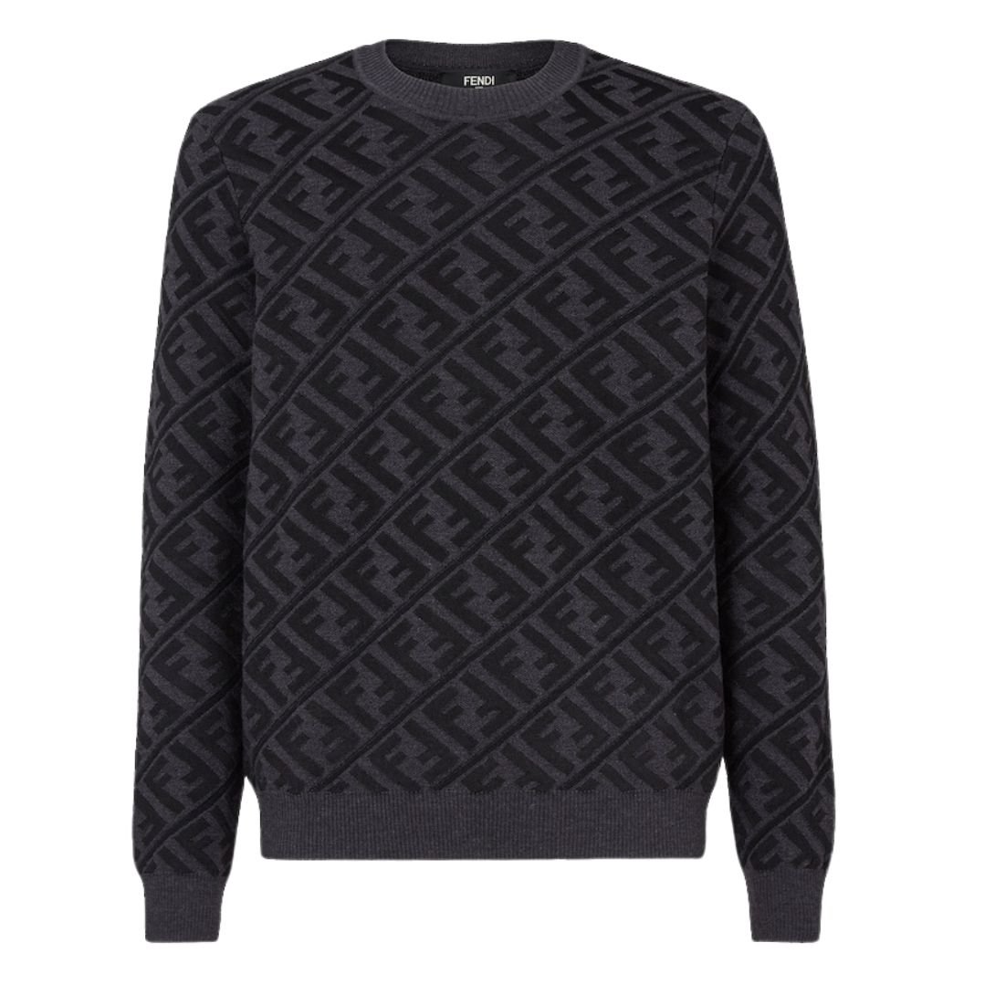 What sets this jumper apart is the striking black-and-gray all-over diagonal jacquard FF motif. This signature design element showcases the iconic Fendi branding in a subtle yet stylish way, adding an air of luxury to your wardrobe. The intricate jacquard pattern brings depth and texture, ensuring the jumper is as visually appealing as it is comfortable.
