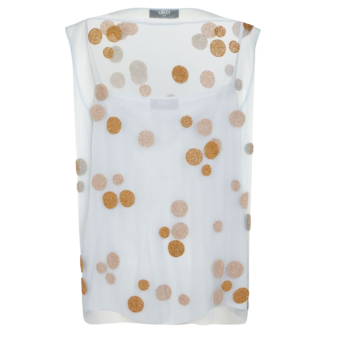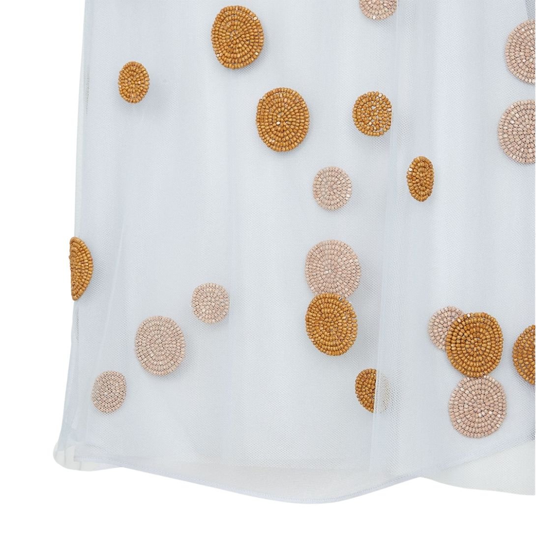 The top is embellished with a large all-over polka-dot motif, created with intricate bead embroidery in contrasting colors. The beads add a touch of sparkle and texture, elevating the garment’s overall aesthetic.