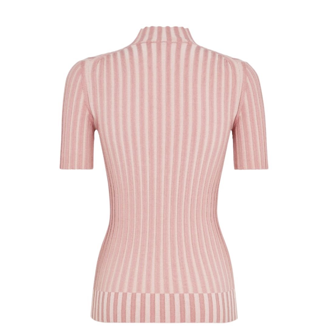 This figure-hugging sweater in light pink cotton offers a flattering, sleek fit with a high collar and short sleeves. The rib-knit construction with a Pequin-effect intarsia adds texture and highlights the sweater’s elasticity, allowing it to contour beautifully to the body. The contrasting Fendi logo intarsia on the chest adds a signature detail, making this sweater both stylish and recognizable.