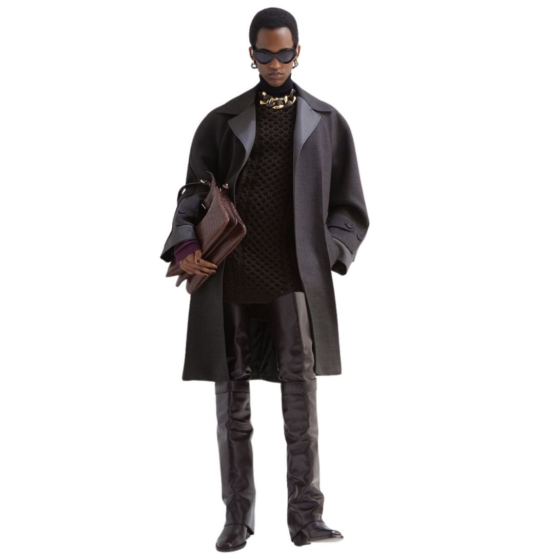 Crafted from dark gray natté fabric, this overcoat offers a sophisticated, textured look. The coat is embellished with contrasting-texture inserts on the sleeves and back, creating a striking double-layer effect.