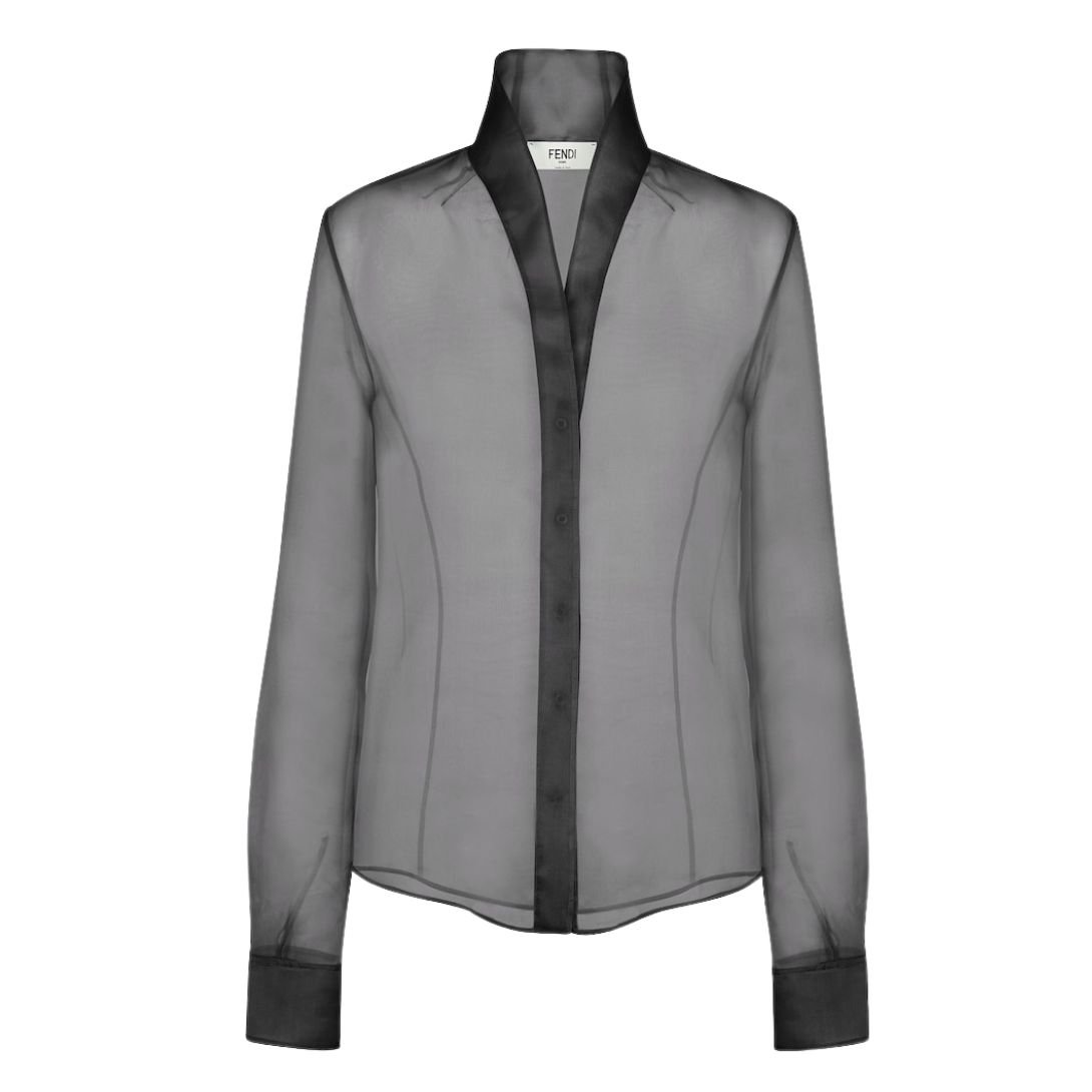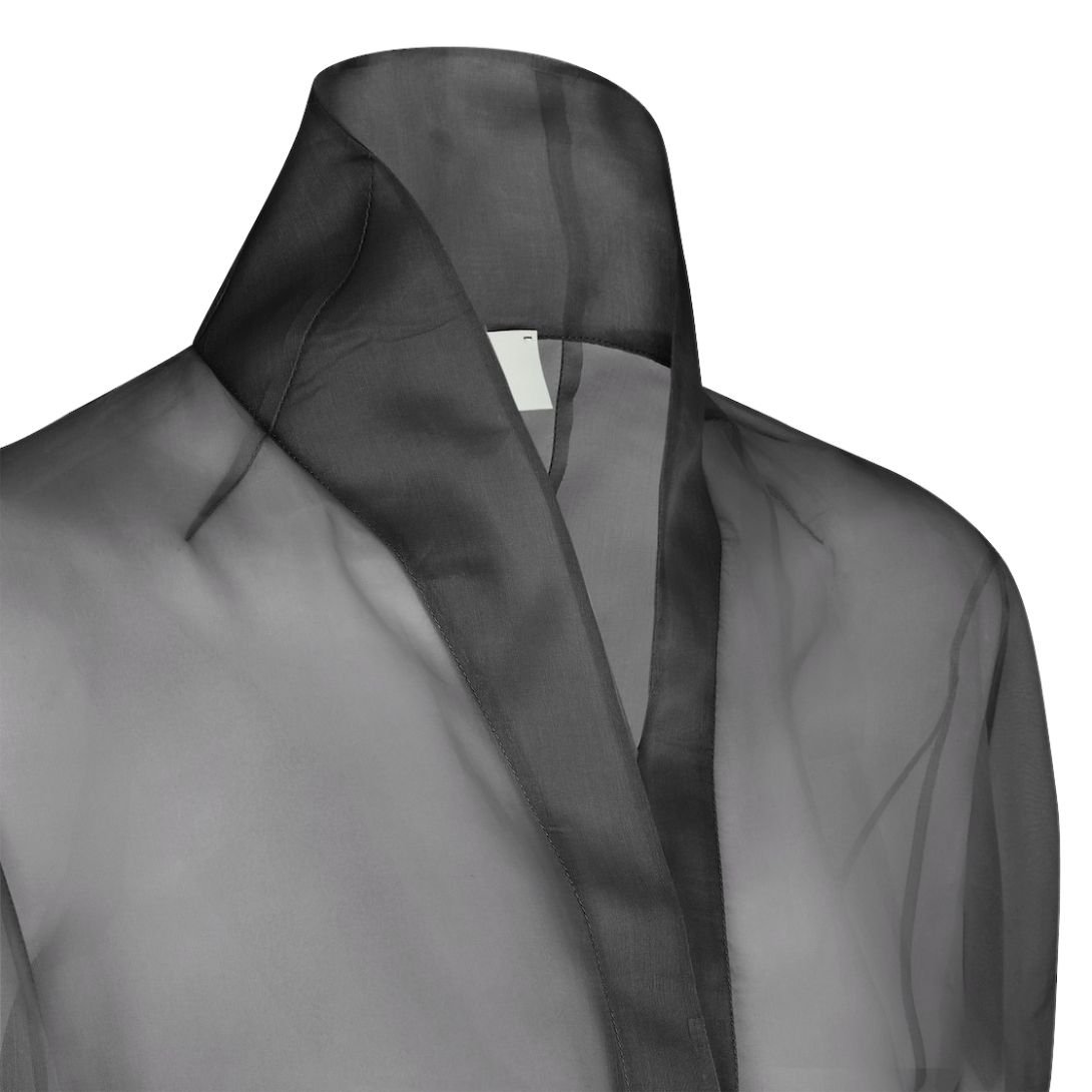 This long-sleeved shirt showcases a slender fit with a V-neckline and raised lapels, creating a refined and tailored aesthetic. The concealed front closure enhances the clean lines of the design, while the lightweight black silk organza fabric adds a subtle touch of elegance.