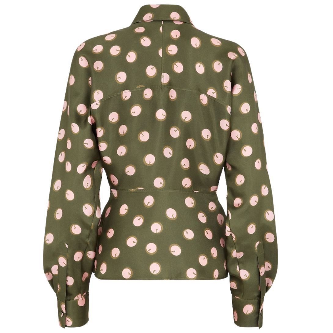Made from luxurious silk twill, the shirt features an all-over dark green and pink polka-dot print with a subtle Fendi motif, blending playful patterns with high-end sophistication.