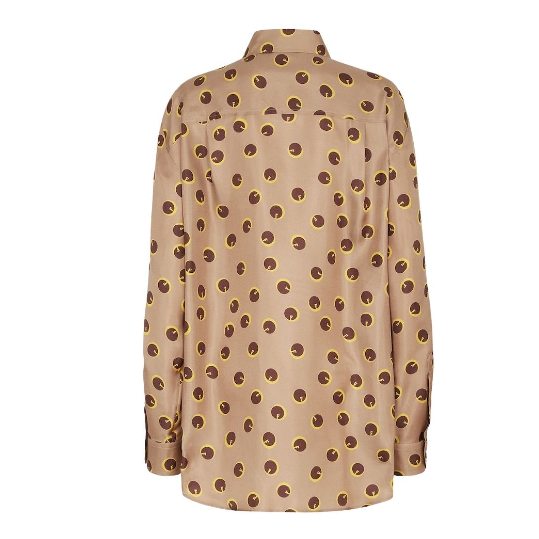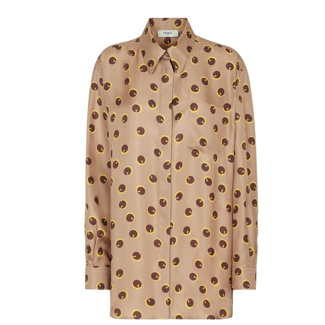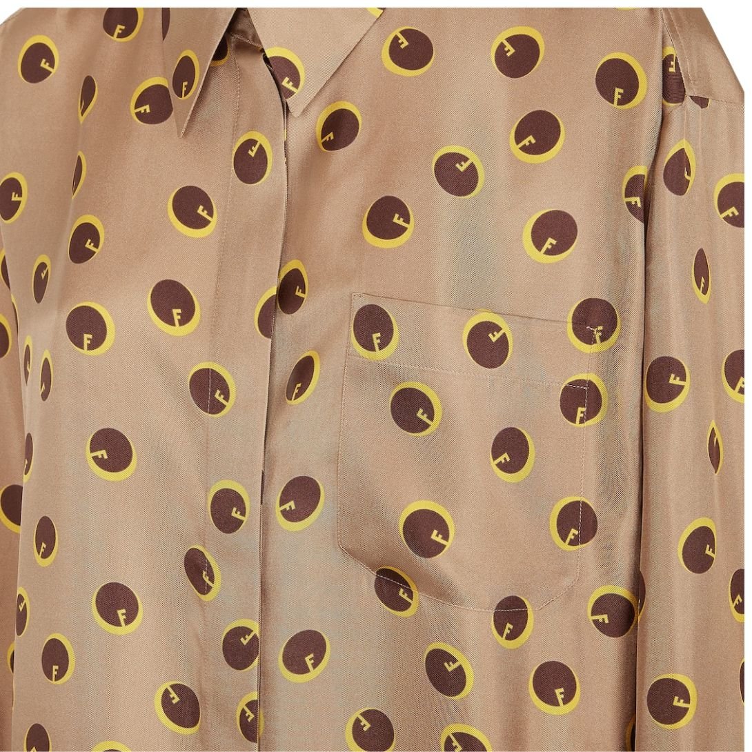 Crafted from light brown silk twill, the shirt is adorned with a striking all-over spotted Fendi motif in dark brown and yellow. The playful yet sophisticated pattern brings depth and character to the flowing silhouette.