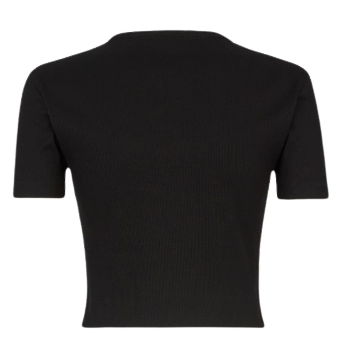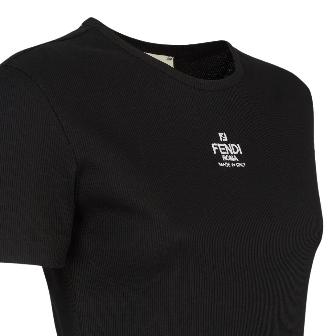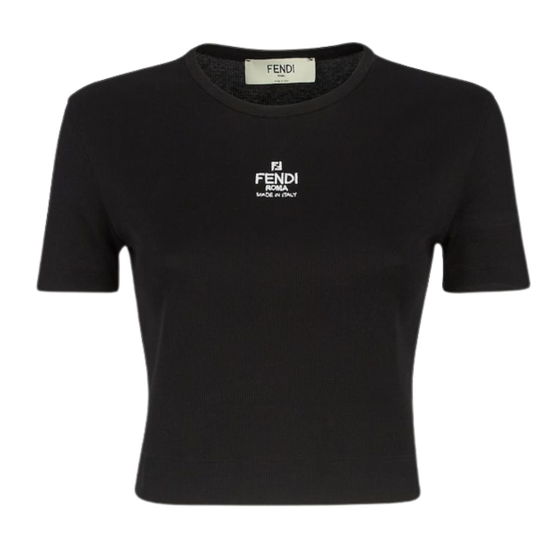 This cropped, slim-fitting top combines sleek design with luxurious detailing for an elevated casual look. Crafted from black ribbed cotton jersey, it offers both comfort and stretch, thanks to its 6% elastane content. The crew neck and short sleeves create a timeless, versatile silhouette that can easily transition between casual and smart-casual outfits. The small, contrasting “FENDI ROMA MADE IN ITALY” logo print on the front adds a refined, branded touch without overpowering the minimalist aesthetic. This top is perfect for layering or wearing solo with high-waisted jeans, skirts, or trousers.