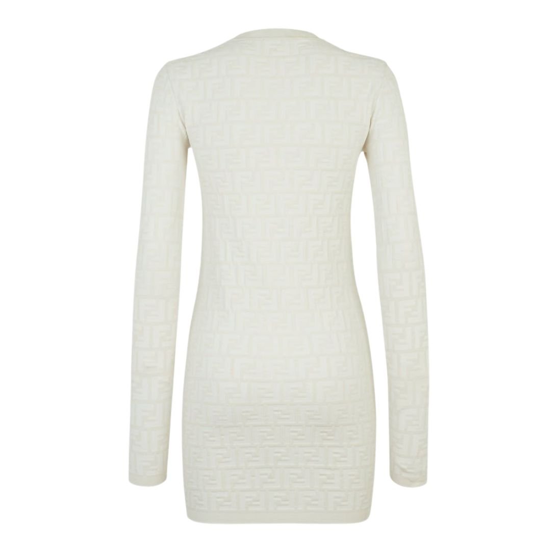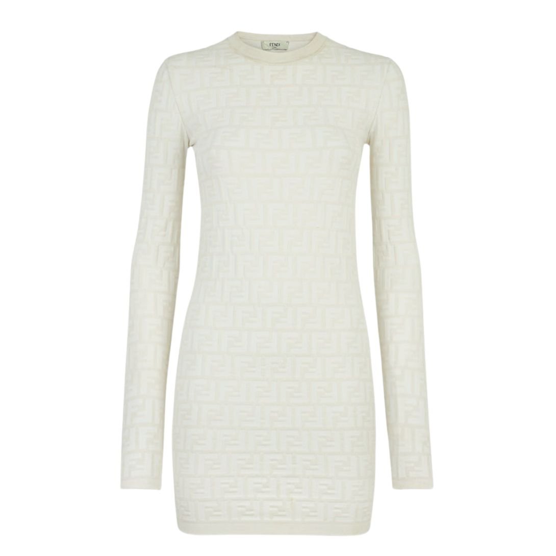 This long-sleeved, round-neck short dress combines sophistication with a sleek, fitted design. Made from a viscose knit, it features a raised all-over FF motif in white, offering a textured and luxurious touch. The slim fit enhances the dress’s flattering silhouette.