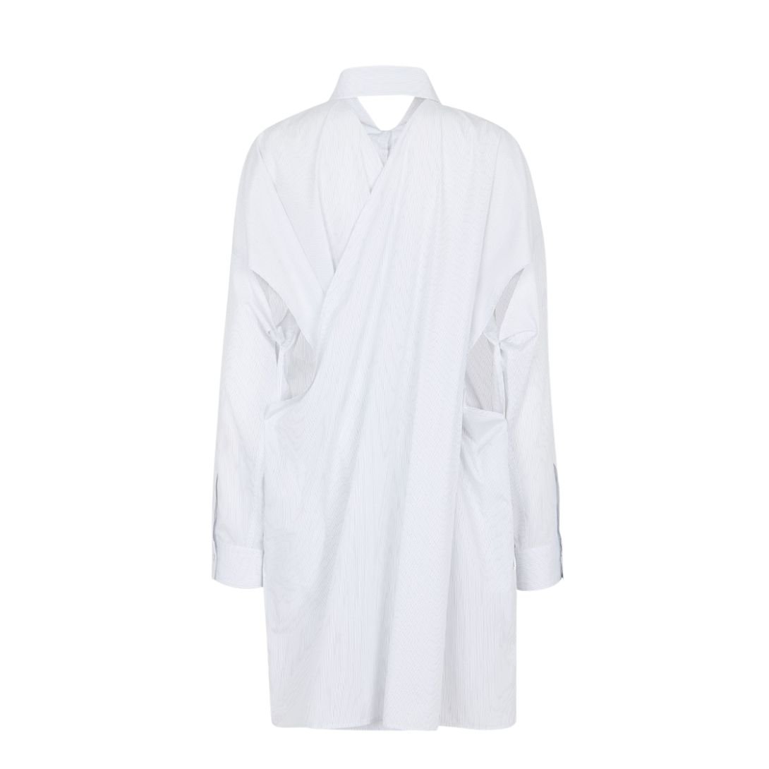 This unique shirt dress combines modern elegance with artistic detailing. Featuring overlapped panels on the back and cut-out details on the sides, it strikes a balance between sophistication and contemporary style.