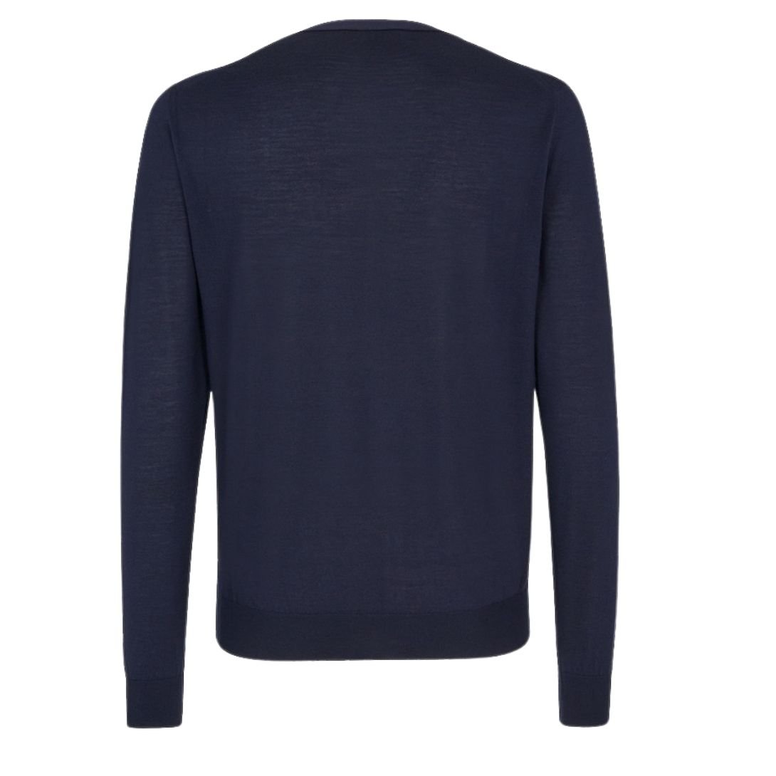 This V-neck cardigan exudes timeless elegance with a classic silhouette, featuring a matching button closure for a refined look. The lightweight Blue wool yarn provides both comfort and breathability, making it a versatile piece for various occasions.