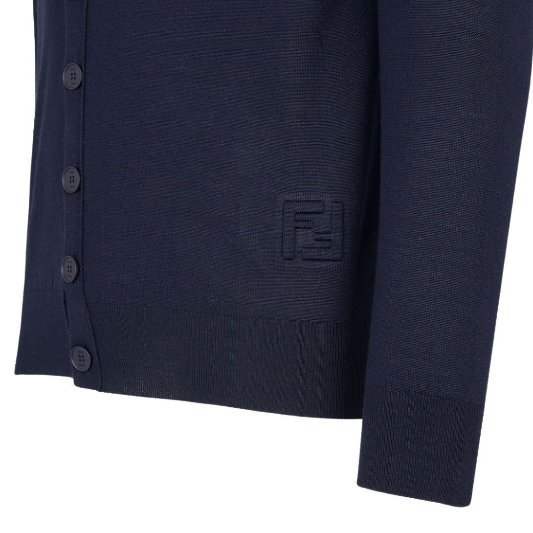 The cardigan is finished with an embossed FF detail on the hem, adding a discreet yet sophisticated nod to Fendi’s iconic branding. This subtle detail enhances the overall design, infusing the piece with a touch of luxury.