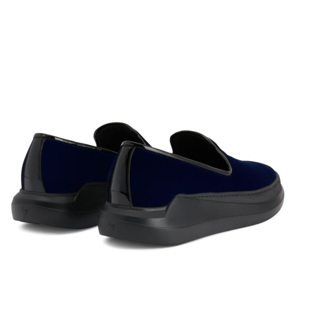 - Material: These slip-ons are made from luxurious velvet-effect blue synthetic fabric, complemented by sleek patent-effect black synthetic fabric details.