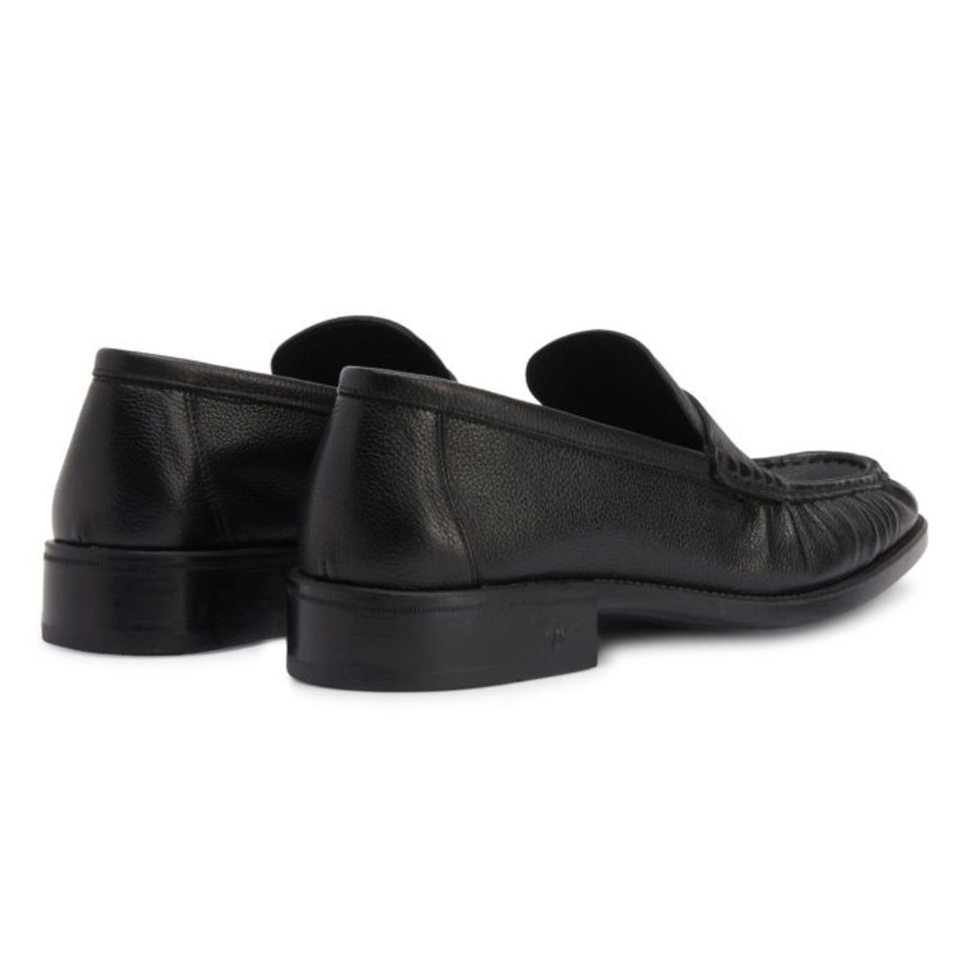 These black leather penny loafers are distinguished by a gathered upper and an elegant light golden metal detail on the front band. The minimalist yet sophisticated design ensures they stand out while remaining versatile.