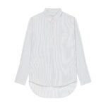 Attention to detail is evident in the finishing touches of this shirt. The collar is a refined point, maintaining a sophisticated edge even in the oversized fit. The button placket, running down the front, is carefully crafted to align with the striped pattern, ensuring a seamless look. The long sleeves can be styled in various ways, either rolled up for a casual vibe or worn down for a more polished appearance.
