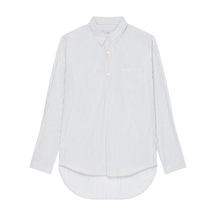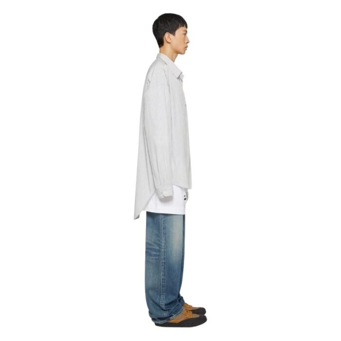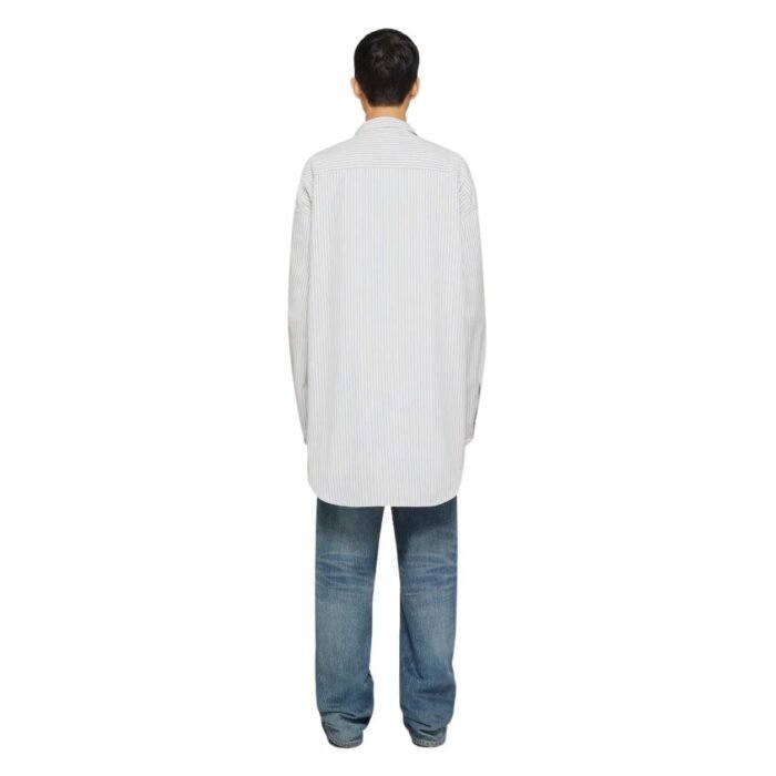 Attention to detail is evident in the finishing touches of this shirt. The collar is a refined point, maintaining a sophisticated edge even in the oversized fit. The button placket, running down the front, is carefully crafted to align with the striped pattern, ensuring a seamless look. The long sleeves can be styled in various ways, either rolled up for a casual vibe or worn down for a more polished appearance.