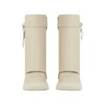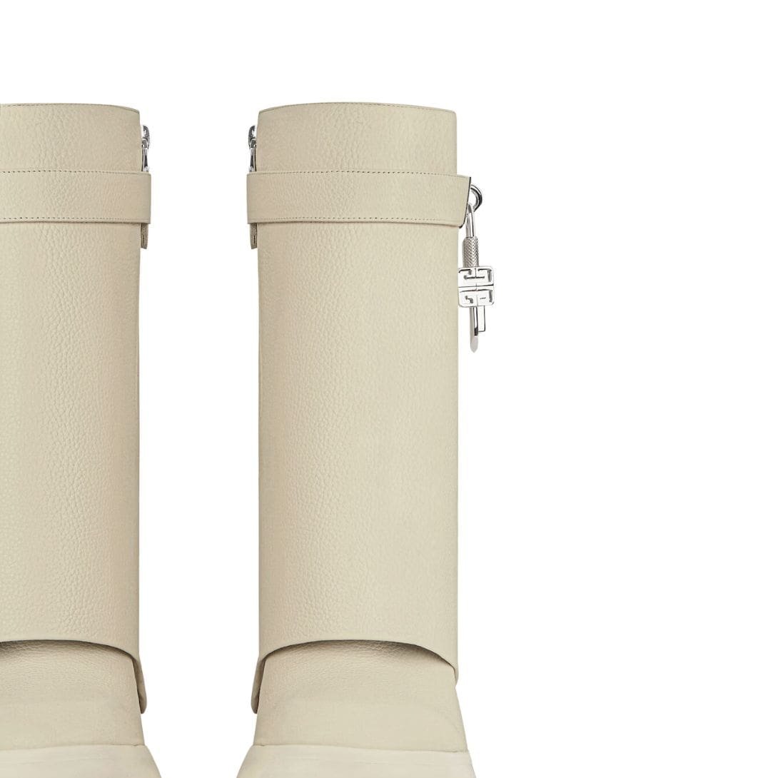 The design is anchored by an asymmetrical strap and lock closure system—a signature feature that defines the Shark Lock collection. This bold locking mechanism not only ensures a secure fit but also serves as a striking design element, enhancing the boots’ edgy, modern appeal. The strap wraps around the ankle, creating a snug fit while the lock detail adds an element of industrial chic.