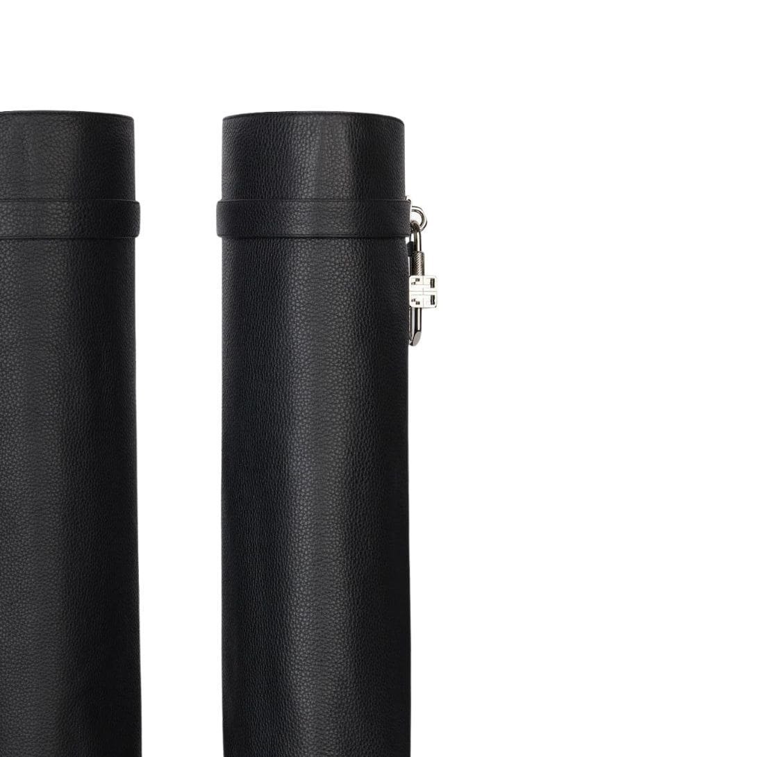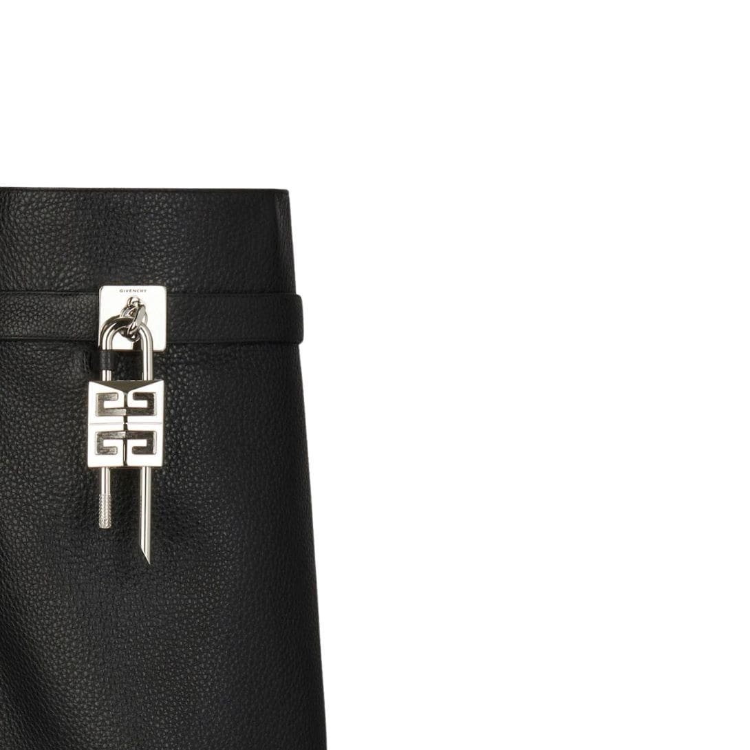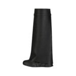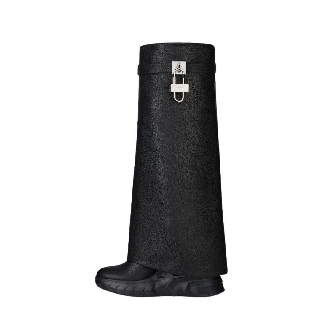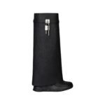 The boots feature a unique shark lock fastening system, a signature element of Givenchy’s innovative design approach. This striking hardware is both functional and decorative, providing a secure closure while adding a touch of avant-garde flair. The shark lock mechanism, with its sleek and modern appearance, complements the overall tough-chic vibe of the boots.