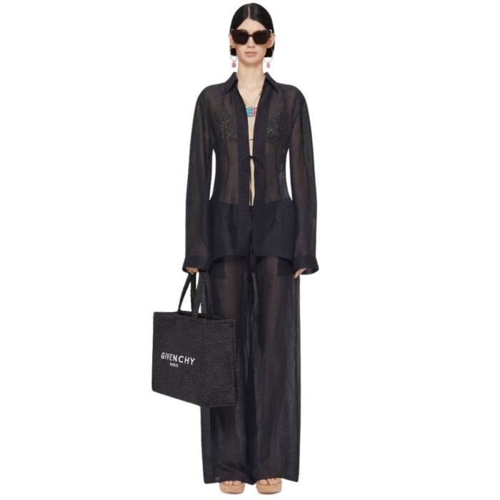 Introducing the Givenchy Shirt In Silk And Linen, crafted from a blend of silk and linen is a luxurious fusion of elegance and comfort. Its lightweight and breathable fabric blend ensures a relaxed yet refined silhouette, making it ideal for both casual and formal occasions. The smooth texture of silk adds a touch of sophistication, while the natural texture of linen lends a relaxed, laid-back vibe. With its impeccable craftsmanship and timeless design, this Givenchy shirt effortlessly embodies the brand’s signature blend of modernity and tradition, making it a versatile wardrobe essential for the discerning fashion enthusiast.