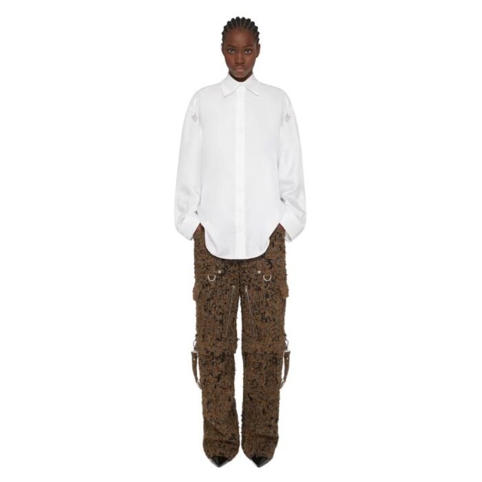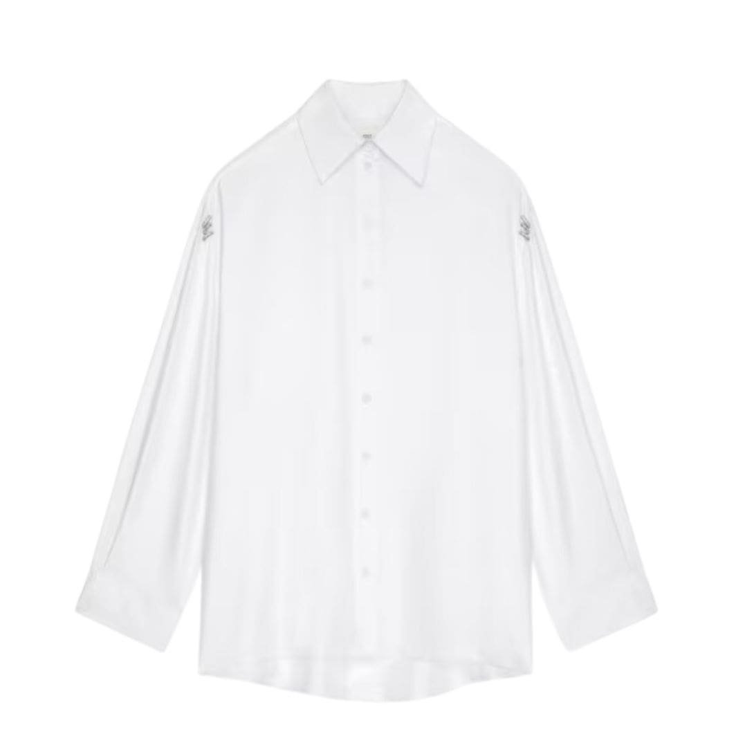Introducing the Givenchy Shirt In Silk With Crystals is the epitome of refined luxury and contemporary sophistication. Crafted from sumptuous silk, this shirt drapes elegantly over the body, offering a smooth and lustrous texture that exudes opulence. The addition of shimmering crystals intricately embellished onto the fabric elevates the piece to a new level of glamour, catching the light with every movement and imparting a sense of celestial allure. With its classic silhouette and exquisite detailing, this Givenchy shirt is a statement piece that effortlessly transitions from day to night, making it a timeless addition to any wardrobe.