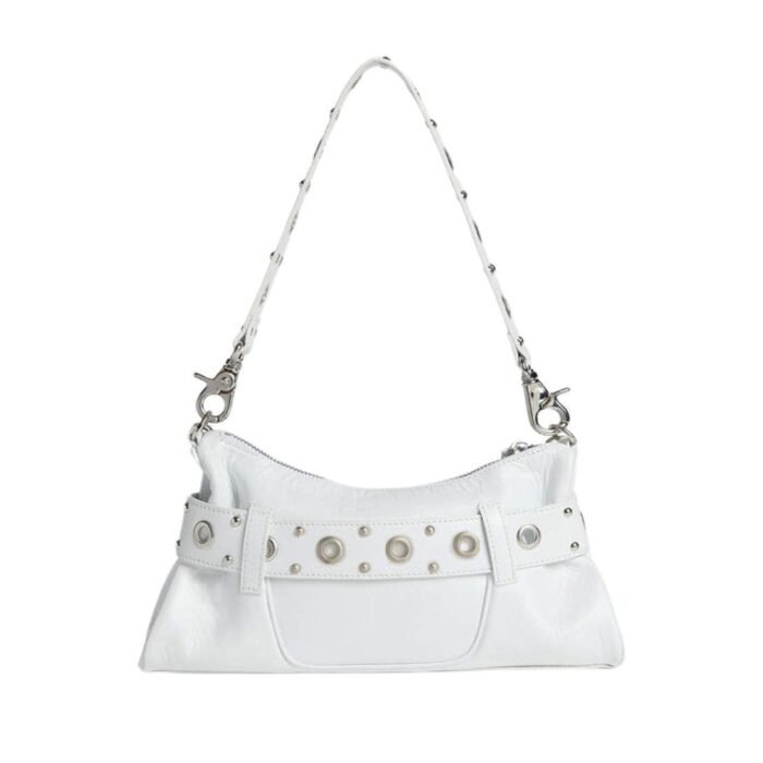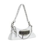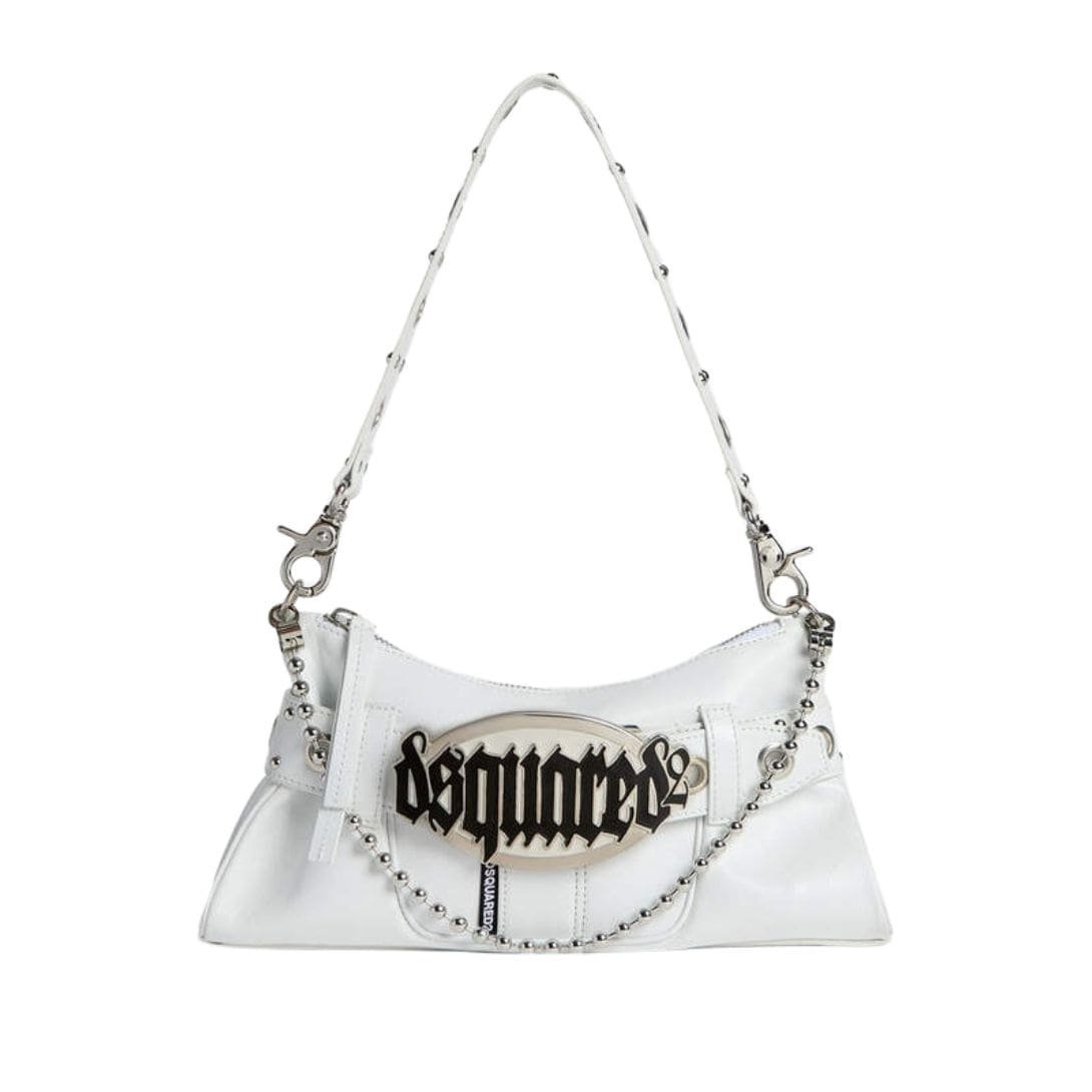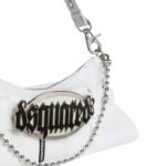A defining characteristic of the Gothic DSquared2 Belt Bag is its distinctive embellishments. The front of the bag prominently displays gothic-inspired metal hardware, including the DSquared2 logo, which is often rendered in an ornate, intricate font that pays homage to medieval script. This gothic lettering adds a dramatic, edgy flair to the bag, setting it apart from more conventional designs.